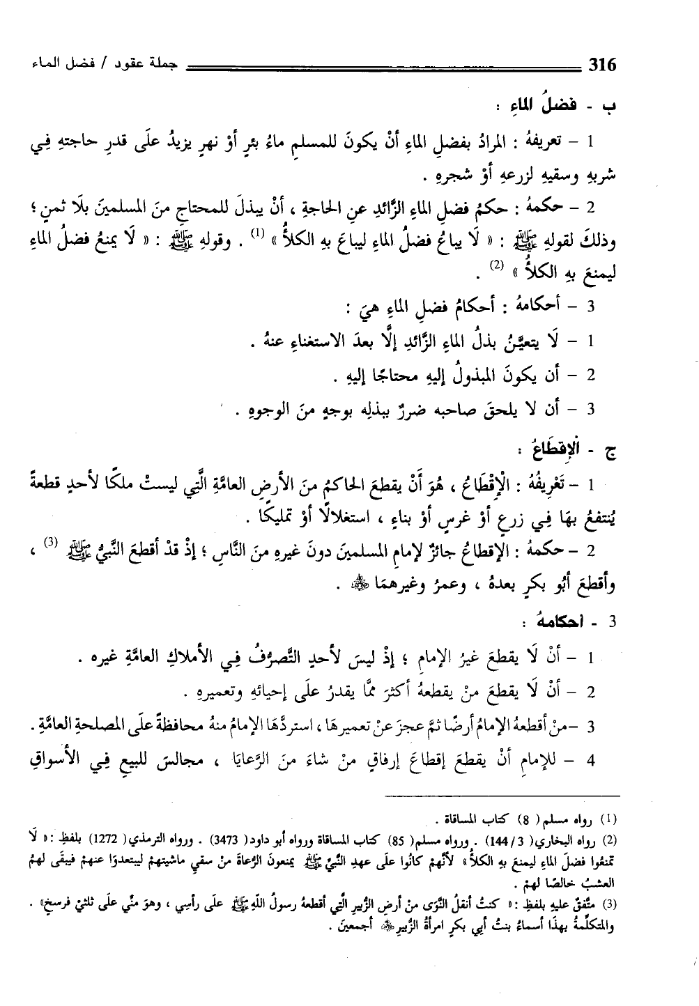 (¬2) رواه البخاري (3/ 144). ورواه مسلم (85) كتاب المساقاة ورواه أبو داود (3473). ورواه الترمذي (1272) بلفظِ: "لا تمنعوا فضلَ الماءِ ليمنعَ بهِ الكلأُ" لأنهم كانُوا علَى عهدِ النبيَّ - صلى الله عليه وسلم - يمنعونَ الرعاةَ من سقي ماشيتهم ليبتعدوَا عنهم فيبقَى لهمُ العشبُ خالصًا لهم.