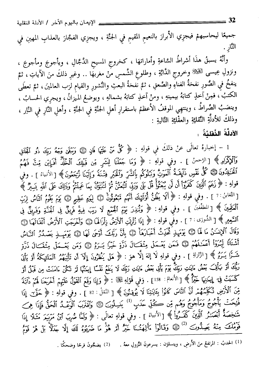 جميعًا ليحاسبهم فيجزِي الأبرارَ بالنعيمِ المقيمِ فيِ الجنَّةِ، ويجزِي الفجَّارَ بالعذابِ المهيِن في النارِ. وأنَّهُ يسبقُ هذَا أشراطُ الساعةِ وأماراتهَا، كخروجِ المسيحِ الدَّجّالِ، ويأجوجَ ومأجوجَ، ونزولِ عِيسى - صلى الله عليه وسلم - وخروجِ الدَّاّبةِ، وطلوعِ الشَّمسِ منْ مغربهَا.. وغيرِ ذلكَ منَ الآياتِ، ثمَّ ينفخُ في الصُّورِ نفخةُ الفناءِ والصّعقِ، ثمَّ نفخةُ البعثِ والنّشورِ والقيامِ لرَب العالمينَ، ثمَّ تعطَى الكتب، فمِنْ آخذٍ كتابَهُ بيمينهِ، ومنْ آخذ كتابَهُ بشمالهِ، ويوضعُ الميزانُ، ويجرِي الحسابُ، وينصَبُ الصِّراطُ، وينتهِي الموقفُ الأعظمُ باستقرارِ أهلِ الجنَّةِ في الجنَّةِ، وأهلِ النَّارِ في النَّاِر، وذلكَ للأدلَّةِ النقليَّةِ والعقْليةِ التّاليةِ: