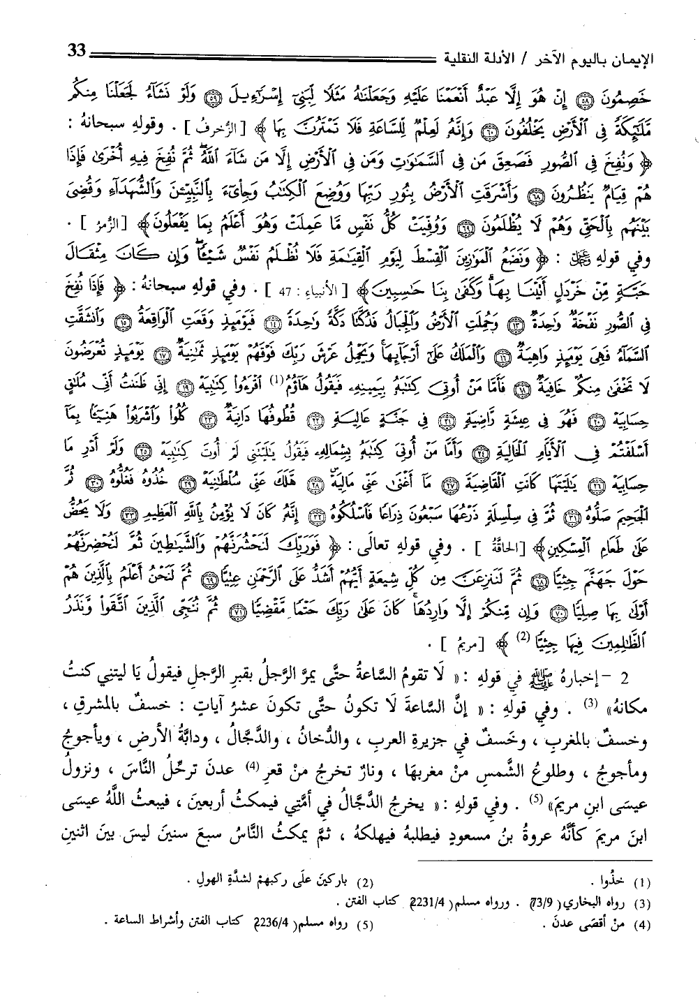 خَصِمُونَ (58) إِنْ هُوَ إِلَّا عَبْدٌ أَنْعَمْنَا عَلَيْهِ وَجَعَلْنَاهُ مَثَلًا لِبَنِي إِسْرَائِيلَ (59) وَلَوْ نَشَاءُ لَجَعَلْنَا مِنْكُمْ مَلَائِكَةً فِي الْأَرْضِ يَخْلُفُونَ (60) وَإِنَّهُ لَعِلْمٌ لِلسَّاعَةِ فَلَا تَمْتَرُنَّ بِهَا وَاتَّبِعُونِ هَذَا صِرَاطٌ مُسْتَقِيمٌ (61) } [الزخرف: 61] {وَنُفِخَ فِي الصُّورِ فَصَعِقَ مَنْ فِي السَّمَاوَاتِ وَمَنْ فِي الْأَرْضِ إِلَّا مَنْ شَاءَ اللَّهُ ثُمَّ نُفِخَ فِيهِ أُخْرَى فَإِذَا هُمْ قِيَامٌ يَنْظُرُونَ (68) وَأَشْرَقَتِ الْأَرْضُ بِنُورِ رَبِّهَا وَوُضِعَ الْكِتَابُ وَجِيءَ بِالنَّبِيِّينَ وَالشُّهَدَاءِ وَقُضِيَ بَيْنَهُمْ بِالْحَقِّ وَهُمْ لَا يُظْلَمُونَ (69) وَوُفِّيَتْ كُلُّ نَفْسٍ مَا عَمِلَتْ وَهُوَ أَعْلَمُ بِمَا يَفْعَلُونَ) [الزمر] . وفي قوله {وَنَضَعُ الْمَوَازِينَ الْقِسْطَ لِيَوْمِ الْقِيَامَةِ فَلَا تُظْلَمُ نَفْسٌ شَيْئًا وَإِنْ كَانَ مِثْقَالَ حَبَّةٍ مِنْ خَرْدَلٍ أَتَيْنَا بِهَا وَكَفَى بِنَا حَاسِبِينَ} [الأنبياء: 47] وفي قوله سبحانه {فَإِذَا نُفِخَ فِي الصُّورِ نَفْخَةٌ وَاحِدَةٌ (13) وَحُمِلَتِ الْأَرْضُ وَالْجِبَالُ فَدُكَّتَا دَكَّةً وَاحِدَةً (14) فَيَوْمَئِذٍ وَقَعَتِ الْوَاقِعَةُ (15) وَانْشَقَّتِ السَّمَاءُ فَهِيَ يَوْمَئِذٍ وَاهِيَةٌ (16) وَالْمَلَكُ عَلَى أَرْجَائِهَا وَيَحْمِلُ عَرْشَ رَبِّكَ فَوْقَهُمْ يَوْمَئِذٍ ثَمَانِيَةٌ (17) يَوْمَئِذٍ تُعْرَضُونَ لَا تَخْفَى مِنْكُمْ خَافِيَةٌ (18) فَأَمَّا مَنْ أُوتِيَ كِتَابَهُ بِيَمِينِهِ فَيَقُولُ هَاؤُمُ (¬1) اقْرَءُوا كِتَابِيَهْ (19) إِنِّي ظَنَنْتُ أَنِّي مُلَاقٍ حِسَابِيَهْ (20) فَهُوَ فِي عِيشَةٍ رَاضِيَةٍ (21) فِي جَنَّةٍ عَالِيَةٍ (22) قُطُوفُهَا دَانِيَةٌ (23) كُلُوا وَاشْرَبُوا هَنِيئًا بِمَا أَسْلَفْتُمْ فِي الْأَيَّامِ الْخَالِيَةِ (24) وَأَمَّا مَنْ أُوتِيَ كِتَابَهُ بِشِمَالِهِ فَيَقُولُ يَا لَيْتَنِي لَمْ أُوتَ كِتَابِيَهْ (25) وَلَمْ أَدْرِ مَا حِسَابِيَهْ (26) يَا لَيْتَهَا كَانَتِ الْقَاضِيَةَ (27) مَا أَغْنَى عَنِّي مَالِيَهْ (28) هَلَكَ عَنِّي سُلْطَانِيَهْ (29) خُذُوهُ فَغُلُّوهُ (30) ثُمَّ الْجَحِيمَ صَلُّوهُ (31) ثُمَّ فِي سِلْسِلَةٍ ذَرْعُهَا سَبْعُونَ ذِرَاعًا فَاسْلُكُوهُ (32) إِنَّهُ كَانَ لَا يُؤْمِنُ بِاللَّهِ الْعَظِيمِ (33) وَلَا يَحُضُّ عَلَى طَعَامِ الْمِسْكِينِ (34) } [الحاقة: 13 - 34] . وفي قوله تعالى: {فَوَرَبِّكَ لَنَحْشُرَنَّهُمْ وَالشَّيَاطِينَ ثُمَّ لَنُحْضِرَنَّهُمْ حَوْلَ جَهَنَّمَ جِثِيًّا (68) ثُمَّ لَنَنْزِعَنَّ مِنْ كُلِّ شِيعَةٍ أَيُّهُمْ أَشَدُّ عَلَى الرَّحْمَنِ عِتِيًّا (69) ثُمَّ لَنَحْنُ أَعْلَمُ بِالَّذِينَ هُمْ أَوْلَى بِهَا صِلِيًّا (70) وَإِنْ مِنْكُمْ إِلَّا وَارِدُهَا كَانَ عَلَى رَبِّكَ حَتْمًا مَقْضِيًّا (71) ثُمَّ نُنَجِّي الَّذِينَ اتَّقَوْا وَنَذَرُ الظَّالِمِينَ فِيهَا جِثِيًّا (¬2) } [مريم: 68 - 72] .