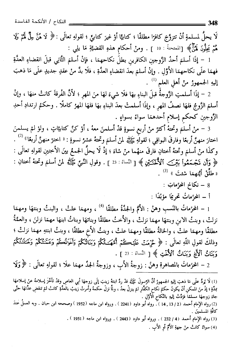 (¬1) لَا يرد علَى مَا ذهبَ إليهِ الجمهورُ أن الرسولَ - صلى الله عليه وسلم - قدْ رد ابنتهُ زينبَ إلَى زوجهَا أبي العاص وقدْ تأخر إسلامهُ عنْ إسلامهَا بمدةٍ، إذ منَ الممكن أنْ يكونَ حكمُ نكاح الكفارِ لم ينزلْ بعدُ، ولما نزلَ حكمهُ وأمرتْ زينبُ بالعدةِ كانت لم تنقض عدتهَا حتى جاءَ زوجهَا مسلمًا فرُدَّتْ إليهِ بالنكاحِ الَأولِ.