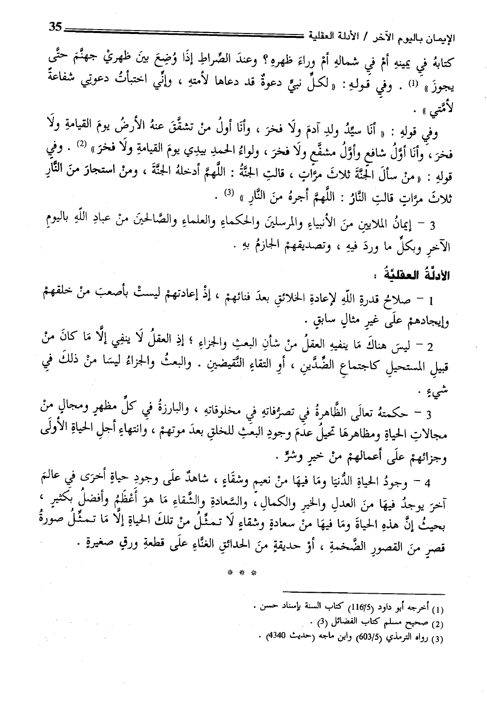 2 - ليسَ هناكَ مَا ينفيهِ العقلُ منْ شأنِ البعثِ والجزاءِ؛ إذِ العقلُ لَا ينفِي إلاَّ مَا كانَ منْ قبيلِ المستحيلِ كاجتماعِ الضِّدَّينِ، أوِ التقاءِ النَّقيضينِ. والبعثُ والجزاءُ ليسَا منْ ذلكَ فيِ شيءٍ.