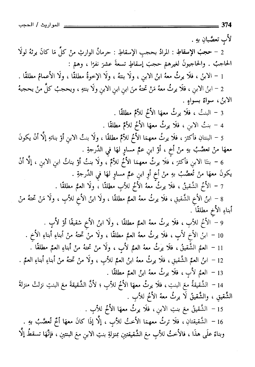 12 - ابنُ العمِّ الشَّقيقِ، فلَا يرثُ معهُ ابنُ العم للأبِ، ولَا منْ تحتهُ منْ أبناءِ أبناءِ العمِّ.