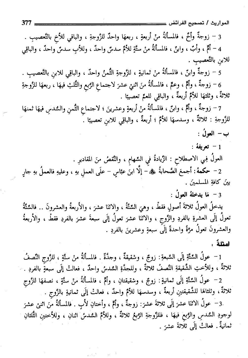 3 - عولُ الاثنَا عشرَ إلَى ثلاثةَ عشرَ: زوجةٌ، وأم، وأختانِ لأبٍ. فالمسألةُ منَ اثنيْ عشرَ لوجودِ السدسِ والربعِ فيهَا، فللزوجةِ الربعُ ثلاثة، وللأمِّ السدس اثنانِ، وللأختينِ الثلثانِ ثمانية. فعالتْ إلَى ثلاثةَ عشرَ.