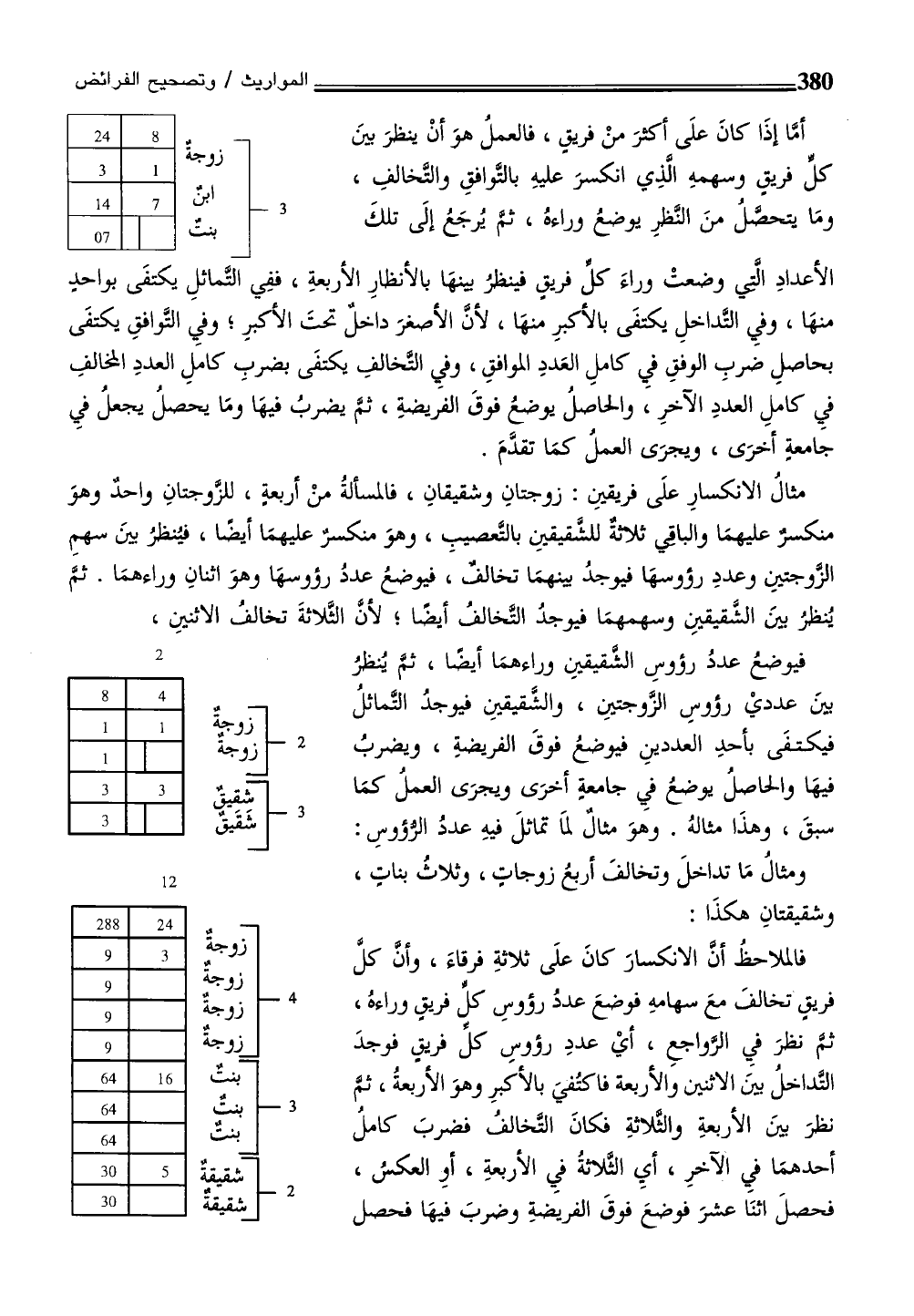 فالملاحظُ أنّ الانكسارَ كانَ علَى ثلاثةِ فرقاءَ، وأن كلَّ فريق تخالفَ معَ سهامهِ فوضعَ عددُ رؤوسِ كلِّ فريق وراءهُ، ثمّ نظرَ فيِ الرواجعِ، أيْ عددِ رؤوسِ كل فريق فوجدَ التداخلُ بينَ الاثنين والأربعة فاكتُفيَ بالأكبرِ وهوَ الأربعةُ، ثم نظرَ بينَ الأربعةِ والثلاثةِ فكانَ التخالفُ فضربَ كاملُ أحدهمَا فيِ الآخرِ، أيِ الثلاثةُ فيِ الأربعةِ، أوِ العكسُ، فحصلَ اثنَا عشرَ فوضعَ فوقَ الفريضةِ وضربَ فيهَا فحصل