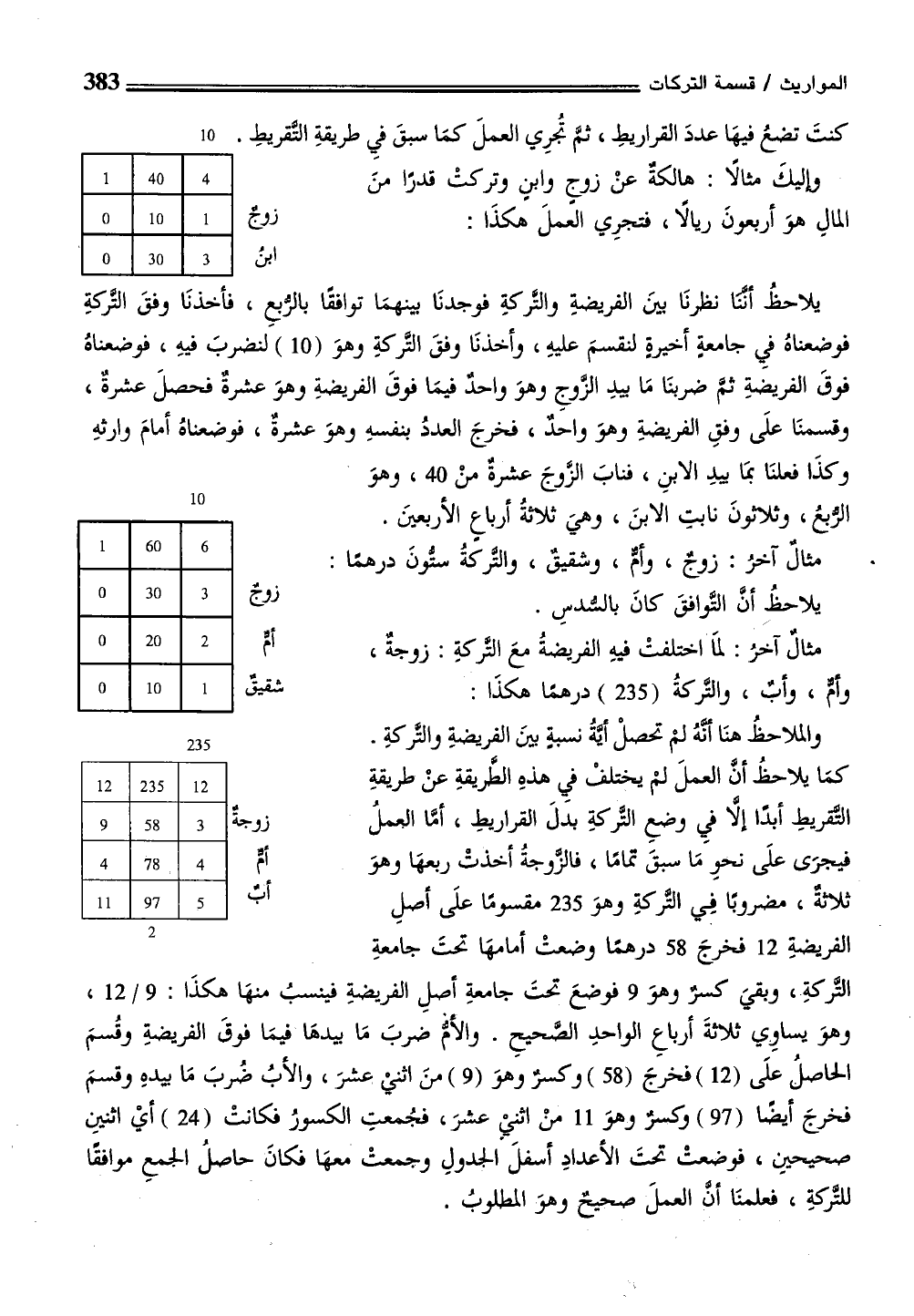 كمَا يلاحظُ أن العملَ لم يختلفْ فيِ هذهِ الطَّريقةِ عنْ طريقةِ التقريطِ أبدًا إلاَّ فيِ وضعِ التركةِ بدلَ القراريطِ، أما العملُ فيجرَى علَى نحوِ مَا سبقَ تمامًا، فالزوجةُ أخذتْ ربعهَا وهوَ ثلاثة، مضروبًا فِي التركةِ وهوَ 235 مقسومًا علَى أصلِ الفريضةِ 12 فخرجَ 58 درهمًا وضعتْ أمامهَا تحتَ جامعةِ ممم التركةِ، وبقيَ كسر وهوَ 9 فوضعَ تحتَ جامعةِ أصلِ الفريضةِ فينسبُ منهَا هكذَا: 9/ 12، وهوَ يساوي ثلاثةَ أرباعِ الواحدِ الصحيحِ. والأمُّ ضربَ مَا بيدهَا فيمَا فوقَ الفريضةِ وقُسمَ الحاصل علَى (12) فخرجَ (58) وكسر وهوَ (9) منَ اثنيْ عشرَ، والأبُ ضُربَ مَا بيدهِ وقسمَ فخرجَ أيضًا (97) كسرٌ وهوَ 11 منْ اثنيْ عشرَ، فجُمعتِ الكسورُ فكانتْ (24) أيْ اثنيِن صحيحيِن، فوضعتْ تحتَ الأعدادِ أسفلَ الجدولِ وجمعتْ معهَا فكانَ حاصلُ الجمعِ موافقًا للتركةِ، فعلمنَا أن العملَ صحيحٌ وهوَ المطلوبُ.