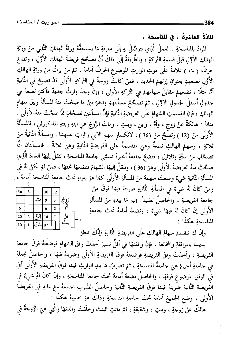 مثالهُ: هالكةٌ عنْ زوج، وأمّ، وابن، وبنتٍ، وماتَ الزَّوجُ عنِ ابنهِ وبنتهِ المذكوريْنِ، فالمسألةُ الأولَى منْ (12) وتصح منْ (36) ، لانكسارِ سهمِ الابنِ والبنتِ عليهمَا. والمسألةُ الثانيةُ منْ ثلاثةٍ، وسهمُ الهالكِ تسعةٌ وهيَ منقسمةٌ علَى الفريضةِ الثَّانيةِ وهيَ ثلاثةٌ. فالمسألتانِ إذًا تصحَّانِ منْ ستةٍ وثلاثينَ، فتضعُ جامعة أخيرة تسمى جامعةَ المناسخةِ، تنقلُ إليهَا العددَ الذِي صحَّتْ منهُ الفريضةُ الأولَى وهوَ (36) ، وتنقلُ إليهَا السهامَ فتضعهَا تحتهَا، فمنْ لم يكنْ لهُ فيِ المسألةِ الثَّانيةِ شيءٌ وضعتَ سهمهُ منَ المسألةِ الأولَى كمَا هوَ بعينهِ تحتَ جامعةِ المناسخةِ أمامهُ، ومنْ كانَ لهُ شيءٌ فيِ المسألةِ الثانيةِ ضربتهُ فيمَا فوقَ منْ جامعةِ الفريضةِ، والحاصلُ تضيف إليهِ مَا بيدهِ منَ المسألةِ الأولى إنْ كانَ لهُ فيهَا شىءٌ، وتضعهُ أمامهُ تحتَ جامعة المناسخةِ هكذَا: ممم
