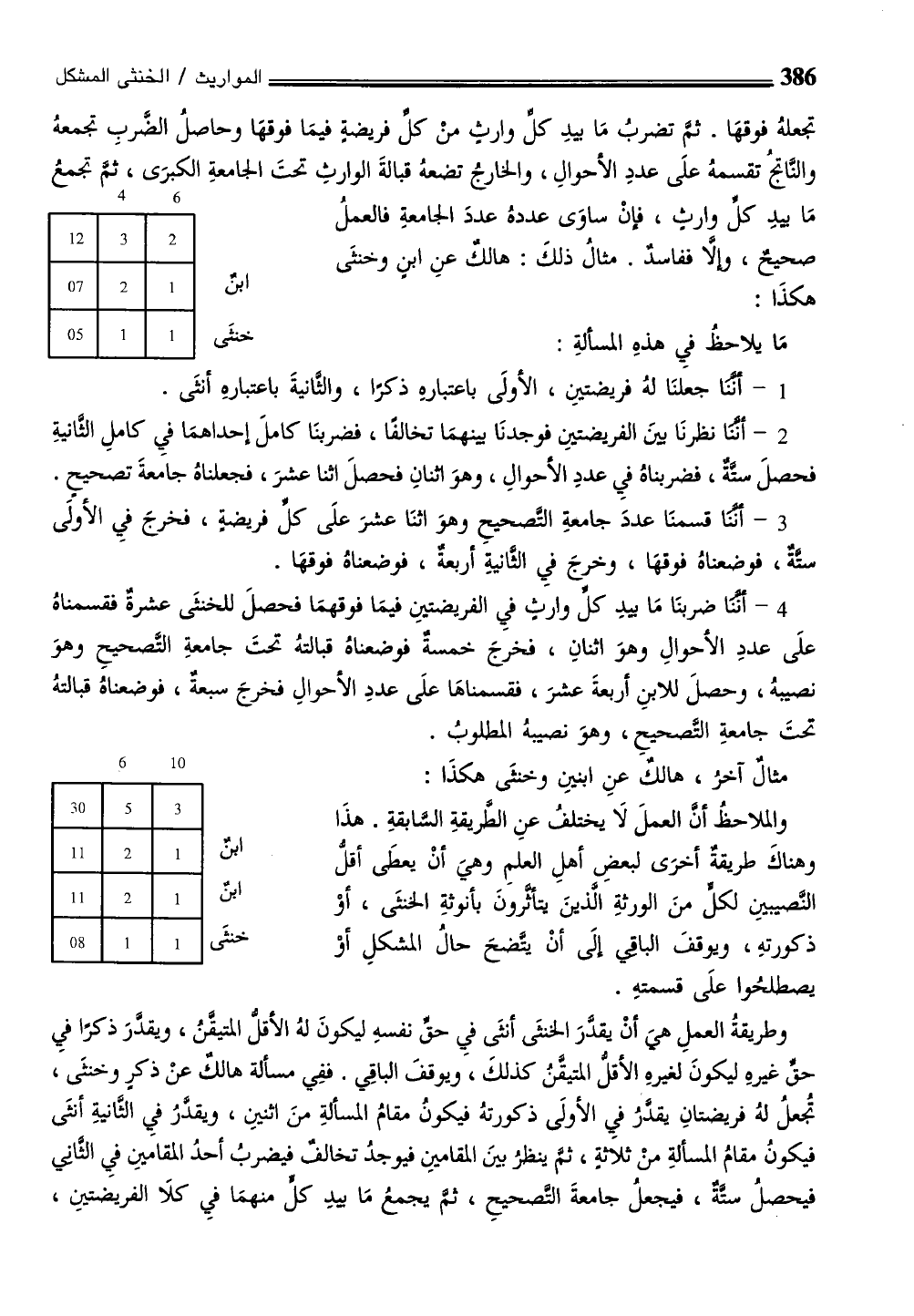 4 - أننا ضربنَا مَا بيدِ كل وارث فيِ الفريضتينِ فيمَا فوقهمَا فحصلَ للخنثَى عشرةٌ فقسمناهُ علَى عددِ الأحوالِ وهوَ اثنانِ، فخرجَ خمسةٌ فوضعناهُ قبالتهُ تحتَ جامعةِ التَّصحيحِ وهوَ نصيبهُ، وحصلَ للابنِ أربعةَ عشرَ، فقسمناهَا علَى عددِ الأحوالِ فخرجَ سبعةٌ، فوضعناهُ قبالتهُ تحتَ جامعةِ التَّصحيحِ، وهوَ نصيبهُ المطلوبُ.