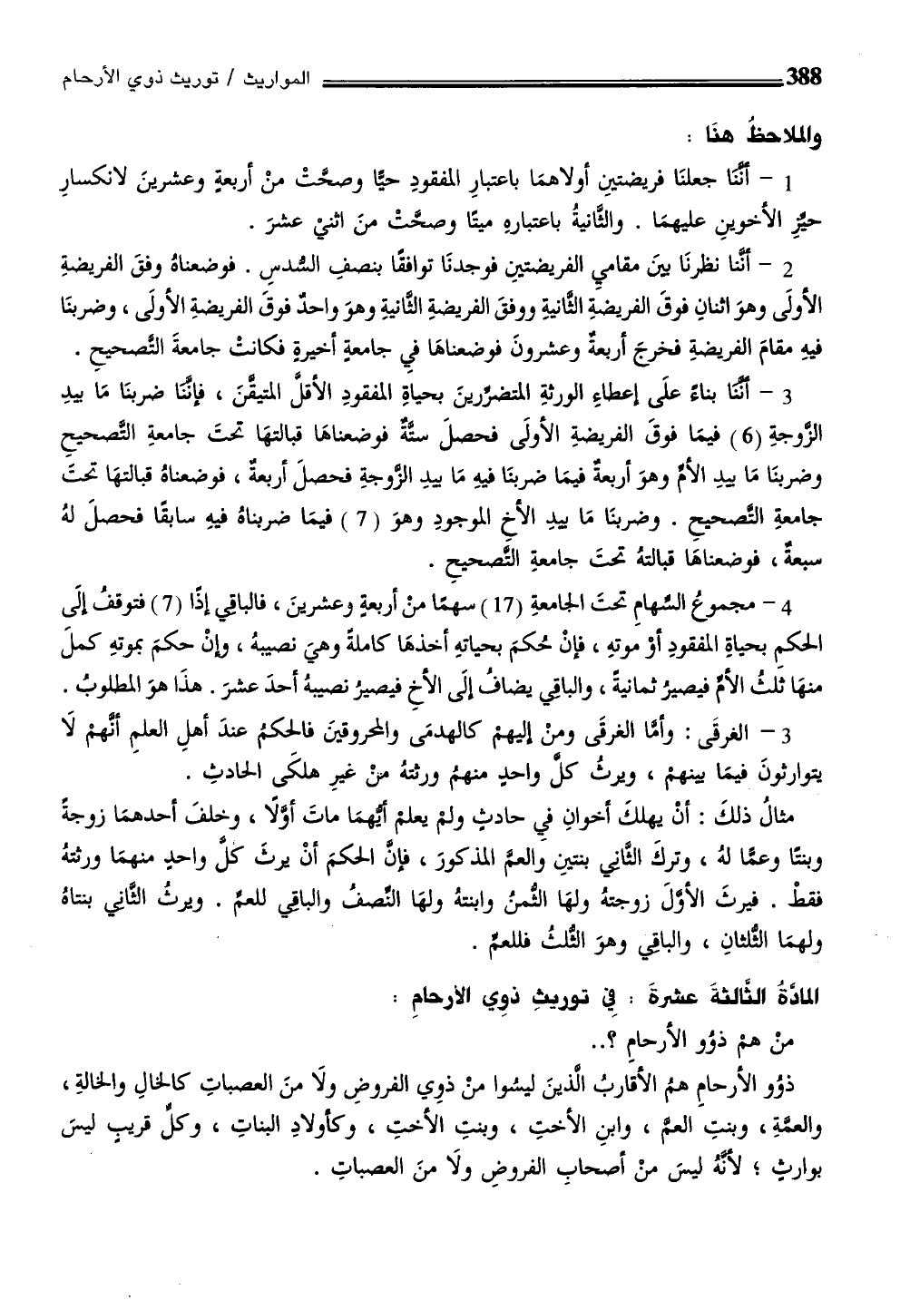 1 - أننا جعلنَا فريضتينِ أولاهمَا باعتبارِ المفقودِ حيًّا وصحتْ منْ أربعةٍ وعشرينَ لانكسارِ حيز الأخوينِ عليهمَا. والثانية باعتبارهِ ميتًا وصحَّتْ منَ اثني عشرَ.
