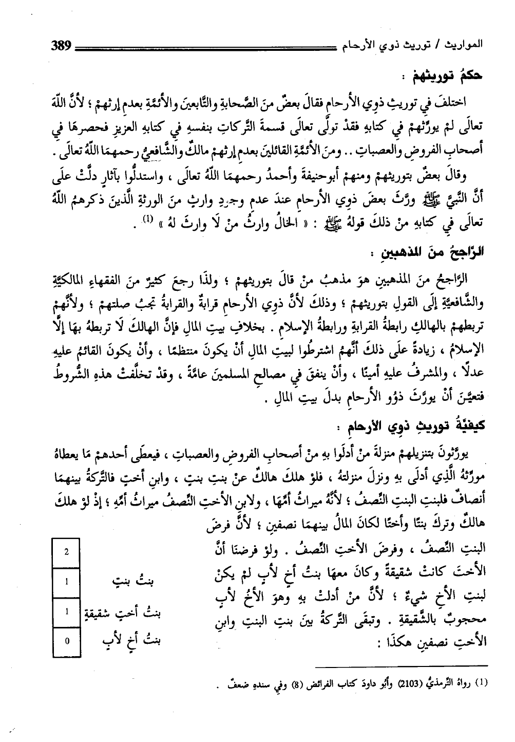 وقالَ بعض بتوريثهم ومنهم أبو حنيفةَ وأحمدُ رحمهمَا اللّهُ تعالَى، واستدلوا بآثارٍ دلتْ على أن النبيَّ - صلى الله عليه وسلم - ورَّثَ بعضَ ذوِي الأرحامِ عندَ عدمِ وجودِ وارثٍ منَ الورثةِ الذينَ ذكرهمُ اللّهُ تعالَى في كتابه منْ ذلكَ قولهُ - صلى الله عليه وسلم -: "الخالُ وارثُ منْ لَا وارثَ لهُ" (¬1) .