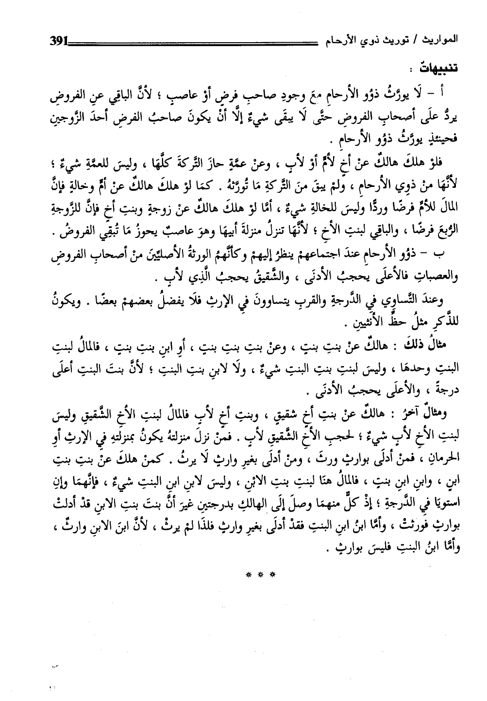 ومثال آخرُ: هالكٌ عنْ بنتِ أخٍ شقيقٍ، وبنتِ أخٍ لأبٍ فالمالُ لبنتِ الأخِ الشقيقِ وليسَ لبنتِ الأخِ لأب شيءٌ؛ لحجبِ الأخِ الشقيقِ لأب. فمنْ نزلَ منزلتهُ يكونُ بمنزلتهِ فيِ الإرثِ أوِ الحرمانِ، فمنْ أدلَى بوارثٍ ورثَ، ومنْ أدلَى بغيرِ وارثٍ لَا يرثُ. كمنْ هلكَ عنْ بنتِ بنتِ ابن، وابنِ ابنِ بنتٍ، فالمالُ هنَا لبنتِ بنتِ الابْنِ، وليسَ لابنِ ابنِ البنتِ شيءٌ، فإنهمَا وإنِ استويَا فيِ الدرجةِ؛ إذْ كل منهمَا وصلَ إلَى الهالكِ بدرجتينِ غيرَ أن بنتَ بنتِ الابنِ قدْ أدلتْ بوارثٍ فورثتْ، وأما ابنُ ابنِ البنتِ فقدْ أدلَى بغيرِ وارثٍ فلذَا لم يرثْ، لأن ابنَ الابنِ وارث، وأما ابنُ البنتِ فليسَ بوارثٍ.