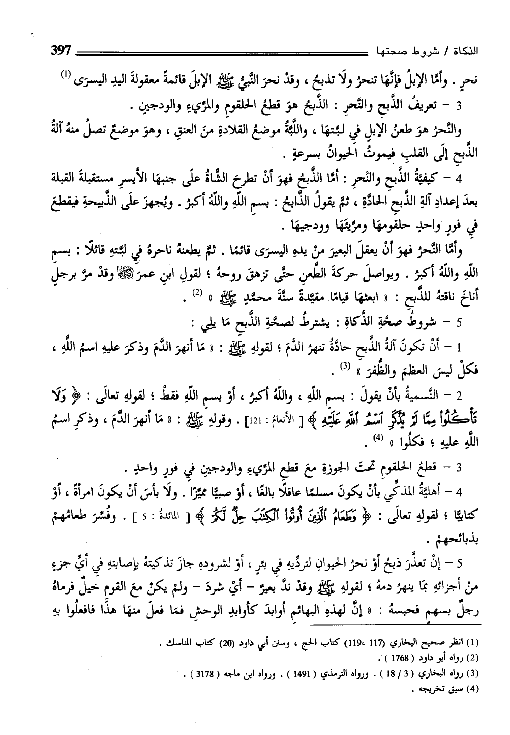 4 - كيفيَّةُ الذَّبحِ والنُّحرِ: أما الذبحُ فهوَ أنْ تطرحَ الشاة علَى جنبهَا الأيسرِ مستقبلةَ القبلة بعدَ إعدادِ آلةِ الذبحِ الحادةِ، ثم يقولُ الذابحُ: بسمِ اللّهِ واللّهُ أكبر. ويُجهزَ علَى الذبيحةِ فيقطعَ فيِ فور واحد حلقومهَا ومريئَهَا وودجيهَا.