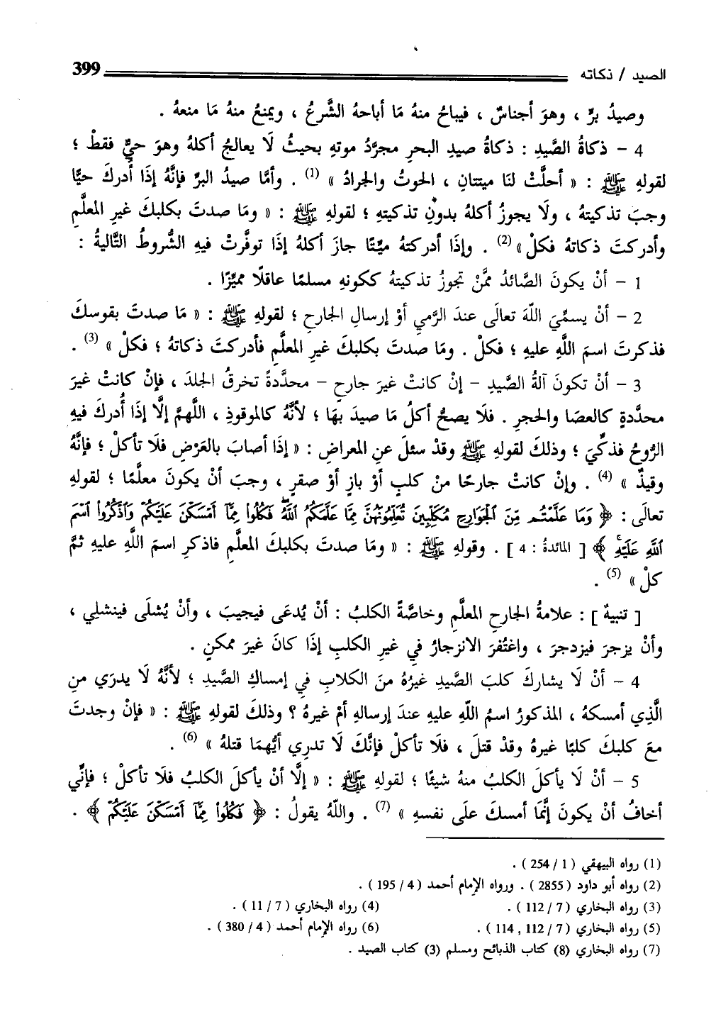 4 - ذكاةُ الصيدِ: ذكاةُ صيدِ البحرِ مجردُ موتهِ بحيثُ لَا يعالجُ أكلهُ وهوَ حيَّ فقطْ؛ لقوله - صلى الله عليه وسلم -: "أحلَّتْ لنَا ميتتانِ، الحوتُ والجرادُ" (¬1) . وأما صيدُ البر فإنَّهُ إذَا أدركَ حيًّا وجبَ تذكيتهُ، ولَا يجوزُ أكلهُ بدون تذكيتهِ؛ لقولهِ - صلى الله عليه وسلم -: "ومَا صدتَ بكلبكَ غير المعلمِ وأدركتَ ذكاتهُ فكلْ" (¬2) . وإذَا أدركتهُ ميتًا جازَ أكلهُ إذَا توفرتْ فيهِ الشروطُ التاليةُ: