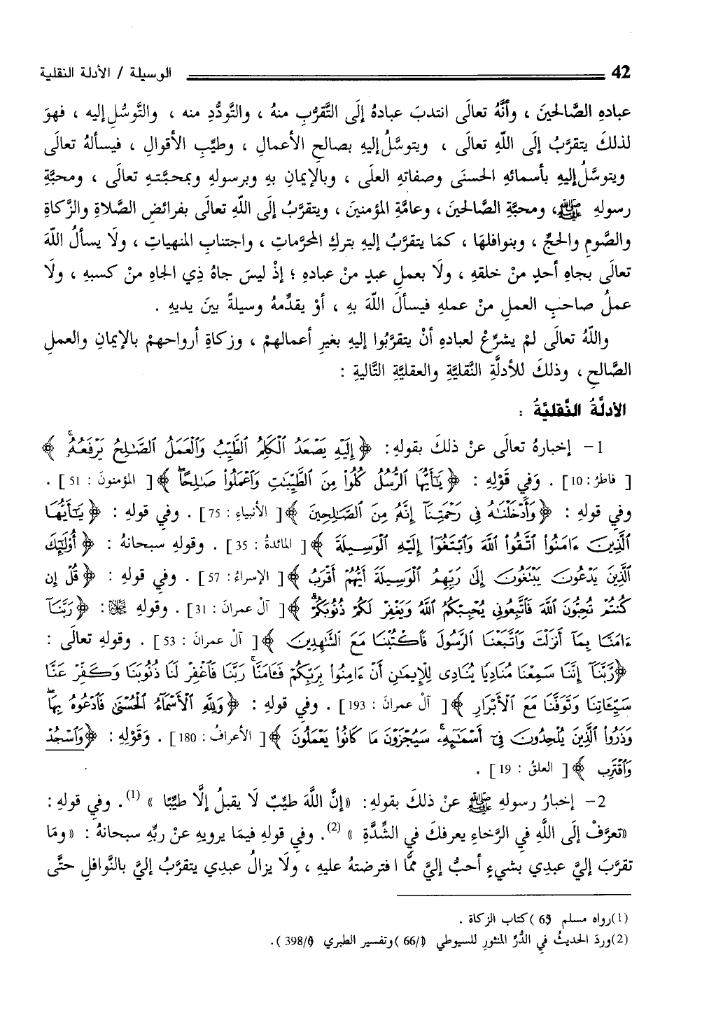 عبادهِ الصَّالحينَ، وأنهُ تعالَى انتدبَ عبادهُ إلَى التَّقربِ منهُ، والتَّودُّدِ منه، والتَّوسلِ إليه، فهوَ لذلكَ يتقرَّبُ إلَى اللّهِ تعالَى، ويتوسَّلُ إليهِ بصالحِ الأعمالِ، وطيبِ الأقوالِ، فيسألهُ تعالَى ويتوسَّلُ إليهِ بأسمائهِ الحسنَى وصفاتهِ العلَى، وبالإيمانِ بهِ وبرسولهِ وبمحبَّتهِ تعالَى، ومحبَّةِ رسولهِ - صلى الله عليه وسلم - ومحبة الصالحين، وعامّة المؤمنينَ، ويتقربُ إلَى اللّهِ تعالَى بفرائضِ الصلاةَ والزّكاةَ والصَّومِ والحجِّ، وبنوافلهَا، كمَا يتقربُ إليهِ بتركِ المحرماتِ، واجتنابِ المنهياتِ، ولَا يسألُ اللّهَ تعالَى بجاهِ أحدٍ منْ خلقهِ، ولَا بعملِ عبد منْ عبادهِ؛ إذْ ليسَ جاهُ ذِي الجاهِ منْ كسبهِ، ولَا عملُ صاحبِ العملِ منْ عملهِ فيسألَ اللّهَ بهِ، أوْ يقدمهُ وسيلة بينَ يديهِ.
