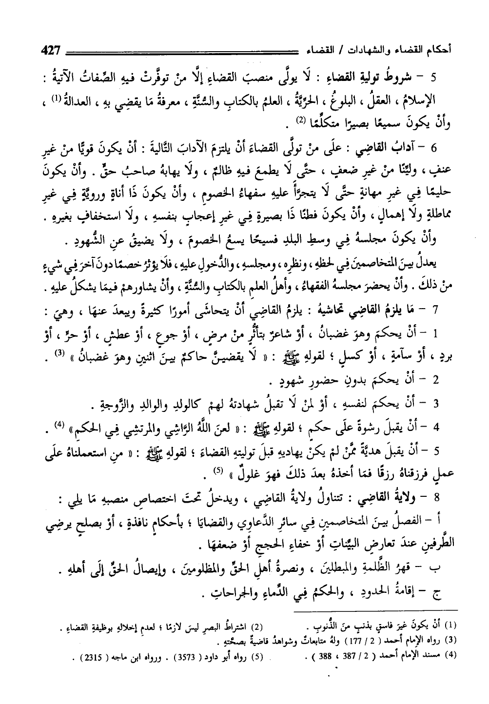 5 - شروطُ توليةِ القضاءِ: لَا يولّى منصبَ القضاءِ إلاَّ منْ توفّرتْ فيهِ الصِّفاتُ الآتيةُ: الإسلامُ، العقلُ، البلوغُ، الحريّةُ، العلمُ بالكتابِ والسنَّةِ، معرفةُ مَا يقضِي بهِ، العدالةُ (¬1) ، وأنْ يكونَ سميعًا بصيرًا متكلِّمًا (¬2) .