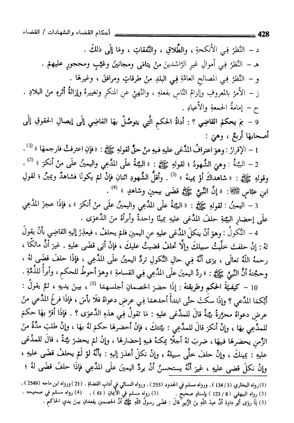 9 - بمَ يحكمُ القاضِي؟: أداةُ الحكمِ اتي يتوصَّلُ بهَا القاضِي إلَى إيصالِ الحقوقِ إلَى أصحابهَا أربعٌ، وهيَ: