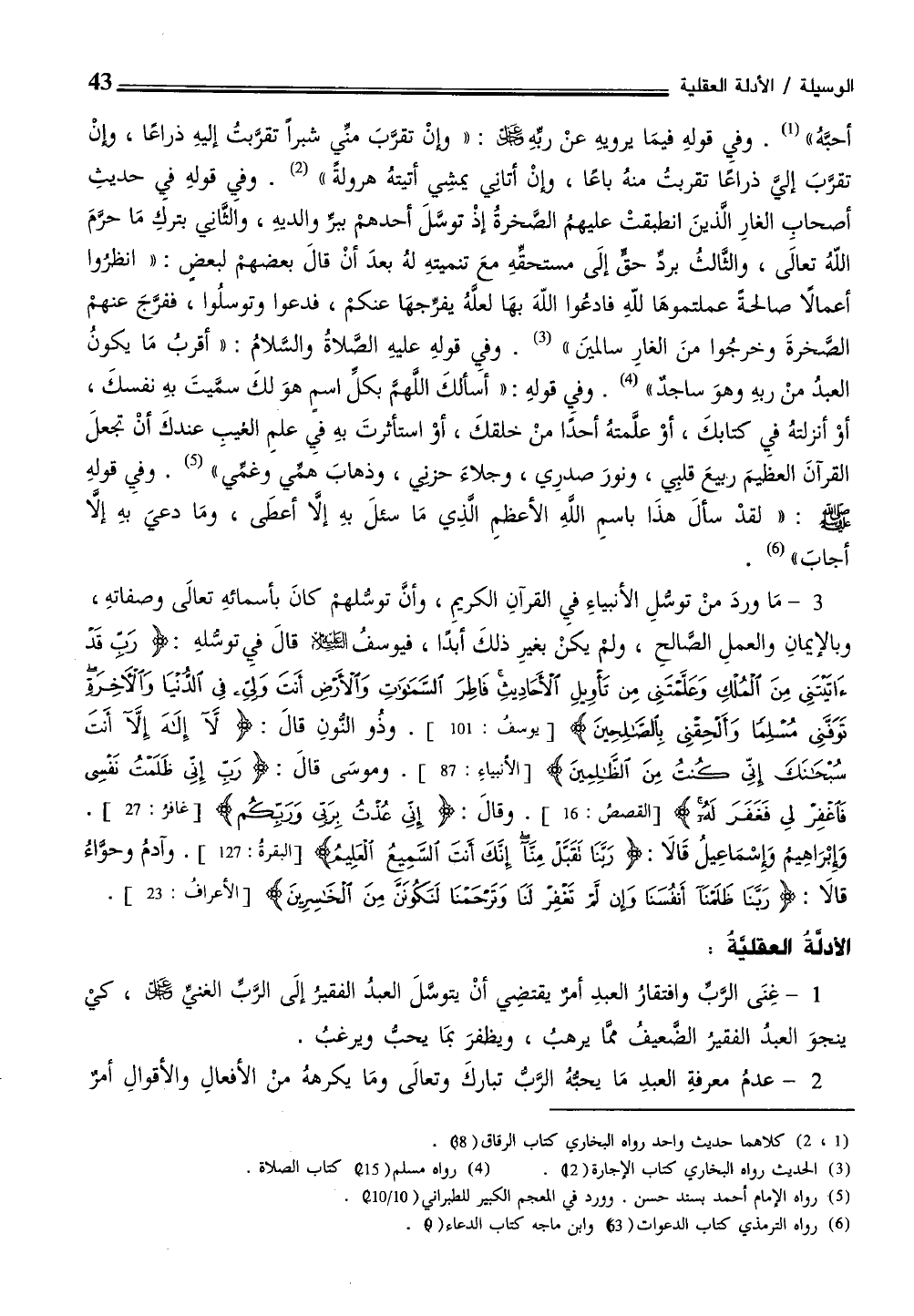 أحبَّهُ" (¬1) . وفيِ قولهِ فيمَا يرويهِ عنْ رِّبهِ عز وجل: "وإنْ تقرَّبَ منِّي شبرًا تقرَّبت إليهِ ذراعًا، وإنْ تقربَ إلي ذراعاً تقربتُ منهُ باعاً، وإنْ أتاني يمشِي أتيتهُ هرولة" (¬2) . وفيِ قولهِ في حديثِ أصحابِ الغارِ الّذينَ انطبقتْ عليهمُ الصَّخرةُ إذْ توسَّلَ أحدهم ببر والديهِ، والثَّاني بتركِ مَا حرَّمَ اللّهُ تعالَى، والثَّالثُ بردِّ حق إلَى مستحقِّهِ معَ تنميتهِ لهُ بعدَ أنْ قالَ بعضهم لبعض: "انظرُوا أعمالاً صالحة عملتموهَا للّهِ فادعُوا اللّهَ بهَا لعلّهُ يفرجهَا عنكم، فدعوا وتوسلُوا، ففرَّجَ عنهم الصَّخرةَ وخرجُوا منَ الغارِ سالمينَ" (¬3) . وفيِ قولهِ عليهِ الصَّلاةُ والسَّلامُ: "أقربُ مَا يكونُ العبدُ منْ ربهِ وهوَ ساجدٌ" (¬4) . وفي قولهِ: "أسألكَ اللَّهمَّ بكلِّ اسم هوَ لكَ سمَّيتَ بهِ نفسكَ، أوْ أنزلتهُ في كتابكَ، أوْ علَّمتهُ أحداً منْ خلقكَ، أوْ استأثرتَ بهِ فيِ علمِ الغيبِ عندكَ أنْ تجعلَ القرآنَ العظيمَ ربيعَ قلبِي، ونورَ صدرِي، وجلاءَ حزني، وذهابَ همِّي وغمِّي" (¬5) . وفيِ قولهِ - صلى الله عليه وسلم -: "لقدْ سألَ هذَا باسم اللّهِ الأعظم الَّذِي مَا سئلَ بهِ إلاَّ أعطَى، ومَا دعيَ بهِ إلاَّ أجابَ" (¬6) .