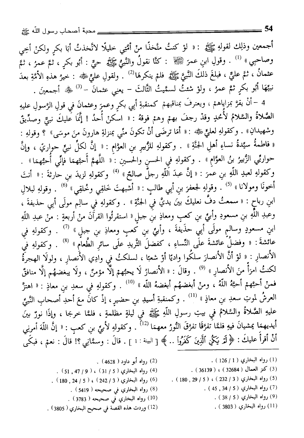 وكقولهِ لعبدِ اللّهِ بنِ عمرَ: "إنَّ عبدَ اللّهِ رجلٌ صالحٌ" (¬4) وكقولهِ لزيدَ بنِ حارثةَ: "أنتَ أخونَا ومولانا" (¬5) . وقولهِ لجعفرَ بنِ أبِي طالبٍ: "أشبهتَ خَلقِي وخُلقِي" (¬6) . وقولهِ لبلالِ ابنِ رباح: "سمعتُ دفَّ نعليكَ بينَ يدي فيِ الجنَّةِ". وكقولهِ في سالِم مولَى أبِي حذيفةَ، وعبدِ اللهِ بنِ مسعودِ وأبي بنِ كعبٍ ومعاذِ بنِ جبل "استقرئُوا القرَآنَ منْ أربعةٍ: منْ عبدِ اللّهِ ابنِ مسعودٍ وسالمٍ مولَى أبِي حذَيفةَ، وأبي بنِ كعبٍ ومعاذِ بنِ جبلٍ" (¬7) . وكقولهِ فيِ عائشةَ: "وفضلُ عائشةَ علَى النساءِ، كفضلَ الثَّريدِ علَى سائرِ الطَّعام" (¬8) . وكقوله في الأنصارِ: "لو أنَّ الأنصارَ سلكُوا واديًا أوْ شعبًا، لسلكتُ في وادِي الأَنصارِ، ولولَا الهجرَةُ لكنتُ امرَأً منَ الأنصارِ" (¬9) . وقالَ: "الأنصارُ لَا يحبُّهم إلاَّ مؤمنٌ، ولَا يبغضهُم إلاَّ منافقٌ فمنْ أحبَّهم أحبَّهُ اللّهُ، ومنْ أبغضهُم أبغضهُ الله" (¬10) . وكقولهِ فيِ سعدِ بنِ معاذ: "اهتزَّ العرشُ لموتِ سعدِ بنِ معاذٍ" (¬11) . وكمنقبةِ أسيدِ بنِ حضيرٍ، إذْ كانَ معَ أحدِ أصحابِ النَّبي عليهِ الصَّلاةُ والسَّلامُ فيِ بيتِ رسولِ اللّهِ - صلى الله عليه وسلم - في ليلةٍ مظلمةٍ، فلمَّا خرجَا، وإذَا نورٌ بينَ أيديهمَا يمشيانَ فيهِ فلمَّا تفرقَا تفرقَ النُّورُ معهمَا (¬12) . وكقولهِ لأبي بنِ كعبٍ: "إنَّ اللّهَ أمرني أنْ أقرأَ عليكَ: {لَم يَكُن اَلذِين كَفَرُوا..} [البينة: 1] . قالَ: وسمَّاني؟! قالَ: نعم، فبكَى