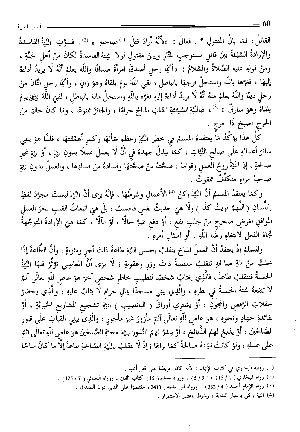 كلُّ هذَا يؤكِّدُ مَا يعتقدهُ المسلمُ في خطرِ النِّيةِ وعظمِ شأنهَا وكبيرِ أهميَّتهَا، فلذَا هوَ يبني سائرَ أعمالهِ علَى صالحِ النِّيّاتِ، كمَاَ يبذلُ جهدهُ فيِ أنْ لَا يعملَ عملًا بدونِ نيَّةٍ، أوْ نيَّة غيرِ صالحةٍ، إذِ النِّيَّةُ روحُ العملِ وقوامهُ، صحَّتهُ منْ صحَّتهَا وفسادهُ منْ فسادِها، والعملُ بدونِ نيَّة صاحبهُ مراءٍ متكلف ممقوتٌ.