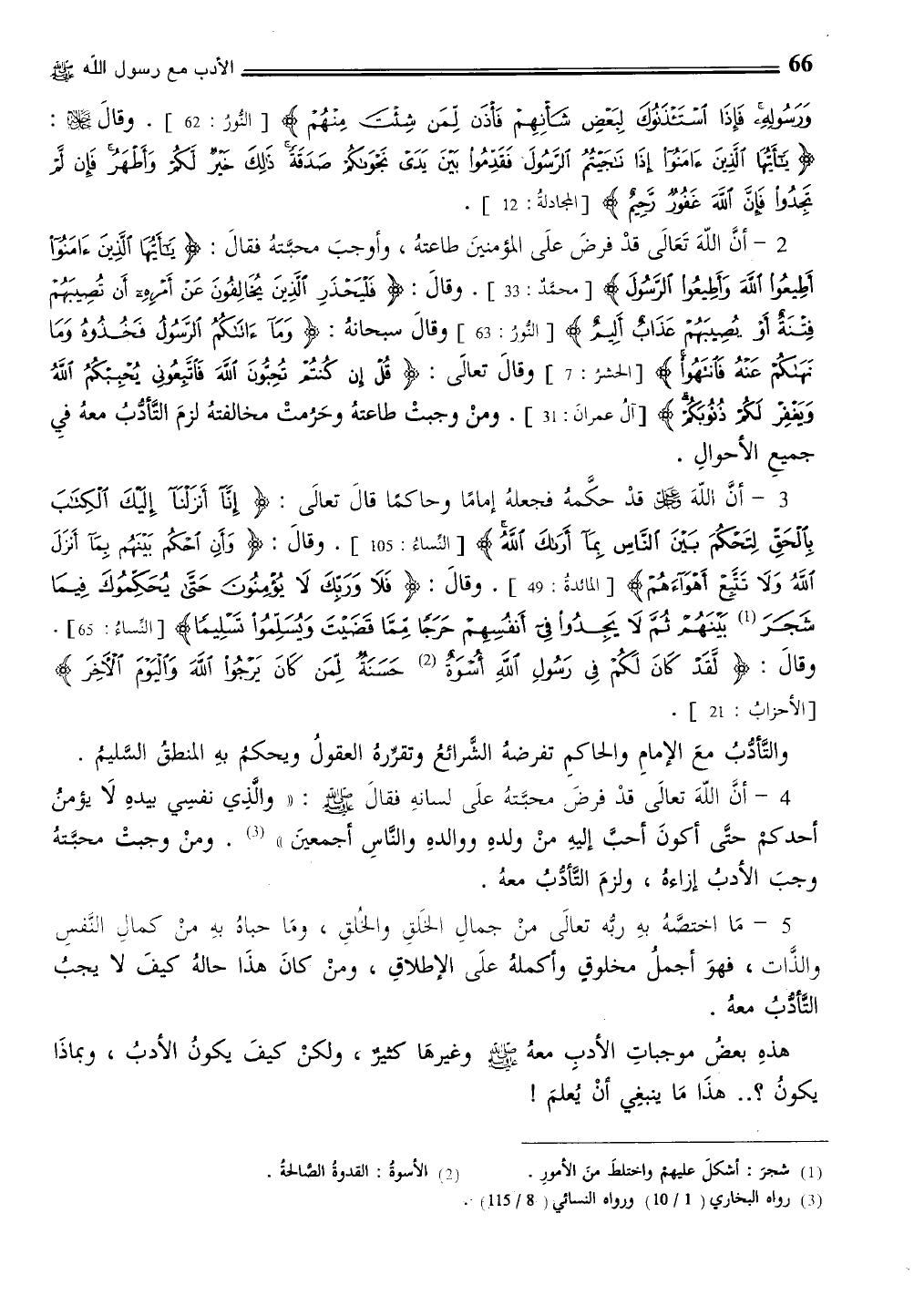 2 - أنَّ اللّهَ تَعَالَى قدْ فرضَ علَى المؤمنينَ طاعتهُ، وأوجبَ محبَّتهُ فقالَ: {يَا أَيُّهَا الَّذِينَ آمَنُوا أَطِيعُوا اللَّهَ وَأَطِيعُوا الرَّسُولَ} [محمد: 33] ". وقالَ: {فَلْيَحْذَرِ الَّذِينَ يُخَالِفُونَ عَنْ أَمْرِهِ أَنْ تُصِيبَهُمْ فِتْنَةٌ أَوْ يُصِيبَهُمْ عَذَابٌ أَلِيمٌ} [النور: 63] وقالَ سبحانهُ: {وَمَا آتَاكُمُ الرَّسُولُ فَخُذُوهُ وَمَا نَهَاكُمْ عَنْهُ فَانْتَهُوا} [الحشر: 7] وقالَ تعالَى: {قُلْ إِنْ كُنْتُمْ تُحِبُّونَ اللَّهَ فَاتَّبِعُونِي يُحْبِبْكُمُ اللَّهُ وَيَغْفِرْ لَكُمْ ذُنُوبَكُمْ وَاللَّهُ غَفُورٌ رَحِيمٌ} [آل عمران: 31] . ومنْ وجبتْ طاعتهُ وحَرمتْ مخالفتهُ لزمَ التأدُّبُ معهُ في جميعِ الأحوالِ.