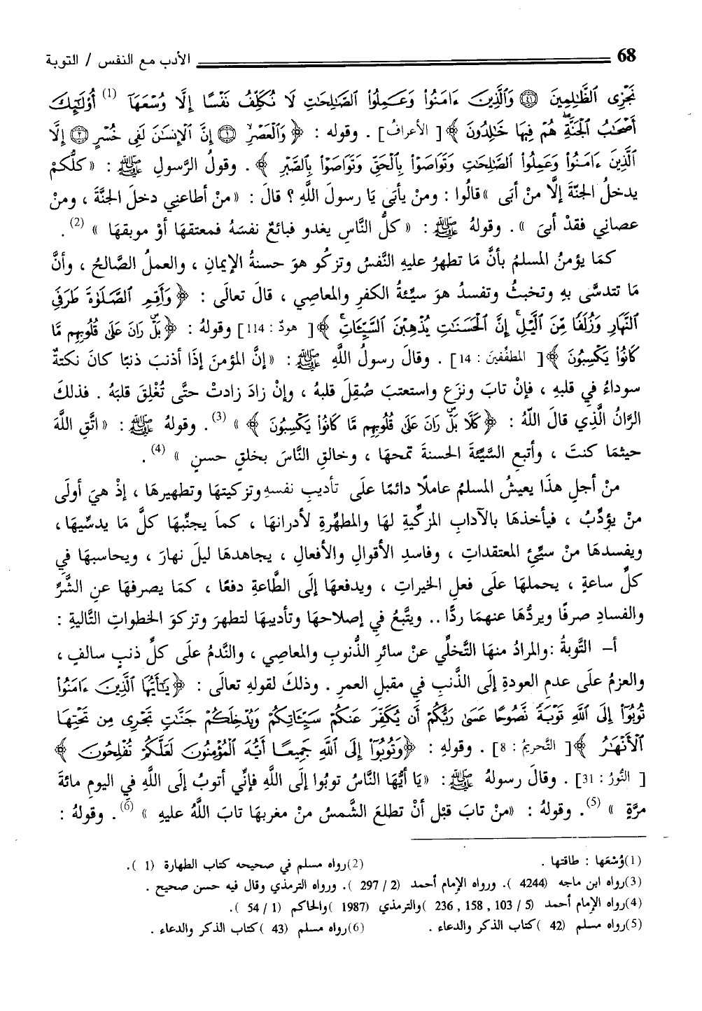 1- التَّوبةُ: والمرادُ منهَا التَّخلِّي عنْ سائرِ الذنوبِ والمعاصِي، والنّدمُ علَى كل ذنبٍ سالفٍ، والعزمُ علَى عدمِ العودةِ إلَى الذّنبِ فيِ مقبلِ العمرِ. وذلكَ لقولهِ تعالَى: {يَا أَيُّهَا الَّذِينَ آمَنُوا تُوبُوا إِلَى اللَّهِ تَوْبَةً نَصُوحًا عَسَى رَبُّكُمْ أَنْ يُكَفِّرَ عَنْكُمْ سَيِّئَاتِكُمْ وَيُدْخِلَكُمْ جَنَّاتٍ تَجْرِي مِنْ تَحْتِهَا الْأَنْهَارُ} [التحريم: 8] . وقولهِ: {وَتُوبُوا إِلَى اللَّهِ جَمِيعًا أَيُّهَ الْمُؤْمِنُونَ لَعَلَّكُمْ تُفْلِحُونَ} [النور: 31] . وقالَ رسولهُ - صلى الله عليه وسلم -: "يَا أيها النَّاسُ توبُوا إلَى اللَّهِ فإنِّي أتوبُ إلَى اللَّهِ في اليومِ مائةَ مرةٍ" (¬5) . وقولهُ: "منْ تابَ قبل أنْ تطلعَ الشَّمسُ منْ مغربهَا تابَ اللَّهُ عليهِ" (¬6) . وقولهُ: