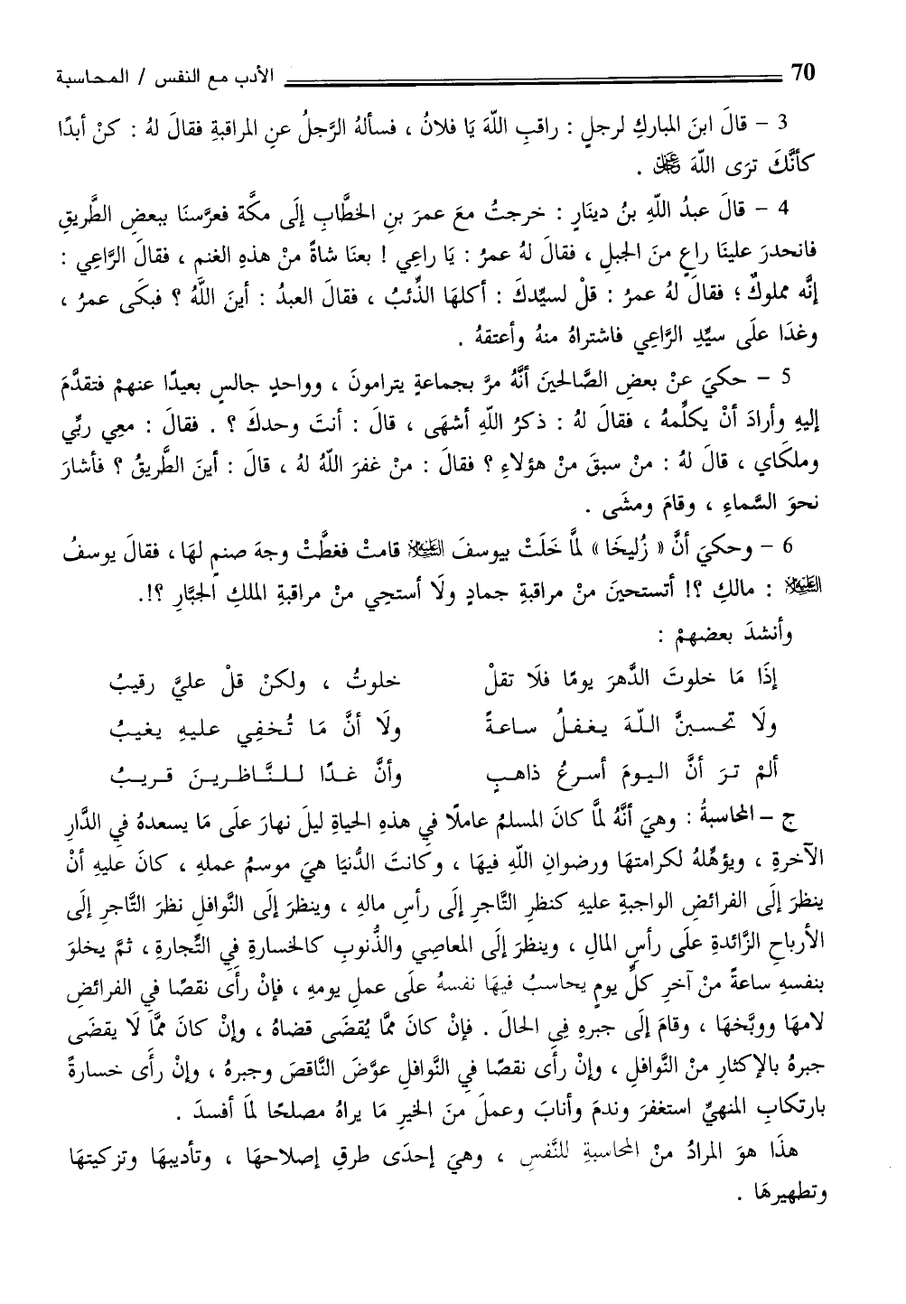 ج - المحاسبةُ: وهيَ أنَّهُ لماَّ كانَ المسلمُ عاملًا في هذهِ الحياةِ ليلَ نهارَ علَى مَا يسعدهُ فيِ الدَّارِ الآخرةِ، ويؤهلهُ لكرامتهَا ورضوانِ اللّهِ فيهَا، وكَانتَ الدّنيَا هيَ موسمُ عملهِ، كانَ عليهِ أنْ ينظرَ إلَى الفرائضِ الواجبةِ عليهِ كنظرِ التَّاجرِ إلَى رأسِ مالهِ، وينظرَ إلَى النَّوافلِ نظرَ التَّاجرِ إلَى الأرباحِ الزَّائدةِ علَى رأس المالِ، وينظرَ إلَى المعاصِي والذُنوبِ كالخسارةِ فيِ التجارةِ، ثمَّ يخلوَ بنفسهِ ساعة منْ آخرِ كل يوم يحاسبُ فيهَا نفسهُ علَى عملِ يومهِ، فإنْ رأَى نقصًا فيِ الفرائضِ لامهَا ووبَّخهَا، وقامَ إلَى جبرهِ في الحالَ. فإنْ كانَ ممَّا يُقضَى قضاهُ، وإنْ كانَ ممَّا لَا يقضَى جبرهُ بالإكثارِ منْ النَّوافلِ، وإنْ رأَى نقصاً فيِ النَّوافلِ عوَّضَ النَّاقصَ وجبرهُ، وإنْ رأَى خسارةً بارتكابِ المنهي استغفرَ وندمَ وأنابَ وعملَ منَ الخيرِ مَا يراهُ مصلحاً لماَ أفسدَ.