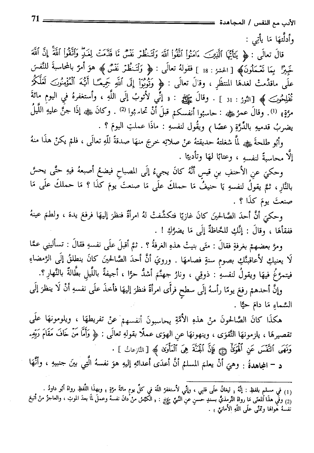 د- المجاهدةُ: وهيَ أنْ يعلمَ المسلمُ أنَّ أعدَى أعدائهِ إليهِ هوَ نفسهُ الَّتي بينَ جنبيهِ، وأنهَا