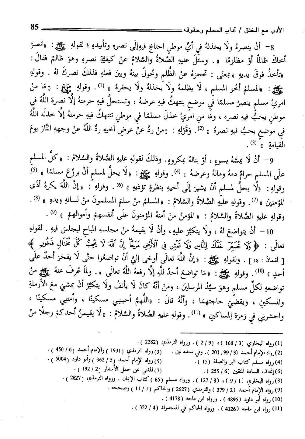 9 - أنْ لَا يمسَّهُ بسوءٍ، أوْ ينالهُ بمكروهٍ. وذلكَ لقولهِ عليهِ الصَّلاةُ والسَّلامُ: "كلُّ المسلمِ علَى المسلم حرامٌ دمهُ ومالهُ وعرضهُ" (¬4) . وقولهِ - صلى الله عليه وسلم -: "لَا يحلُّ لمسلمٍ أنْ يروِّعَ مسلمًا" (¬5) . وقولهِ: "لا يحلُّ لمسلم أنْ يشيرَ إلَى أخيهِ بنظرةٍ تؤذيهِ" (¬6) . وقولهِ: "إنَّ اللَّهَ يكرهُ أذَى المؤمنينَ" (¬7) . وقولهِ عليهِ الصَّلاةُ والسلامُ: "المسلمُ منْ سلمَ المسلمونَ منْ لسانهِ ويدهِ" (¬8) . وقولهِ عليهِ الصَّلاةُ والسلامُ: "المؤمنُ منْ أمنهُ المؤمنونَ علَى أنفسهم وأموالهم" (¬9) .