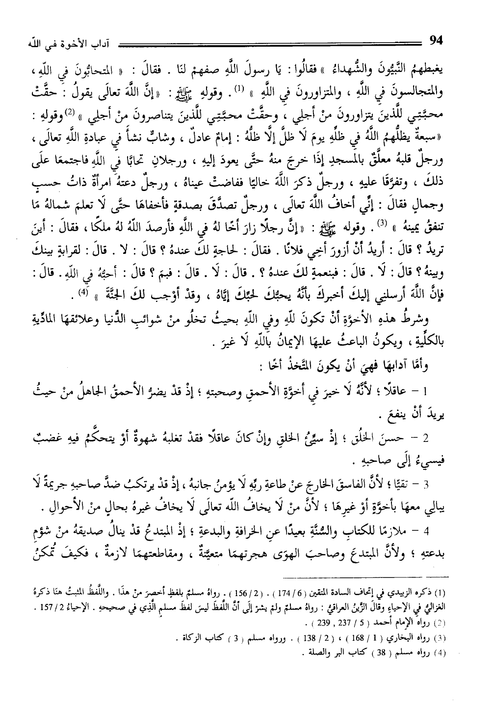وشرطُ هذهِ الأخوَّةِ أنْ تكونَ للّهِ وفيِ اللّهِ بحيثُ تخلُو منْ شوائبِ الدّنيا وعلائقهَا المادّيةِ بالكلّيةِ، ويكونُ الباعثُ عليهَا الإيمانُ باللّهِ لَا غيرَ.