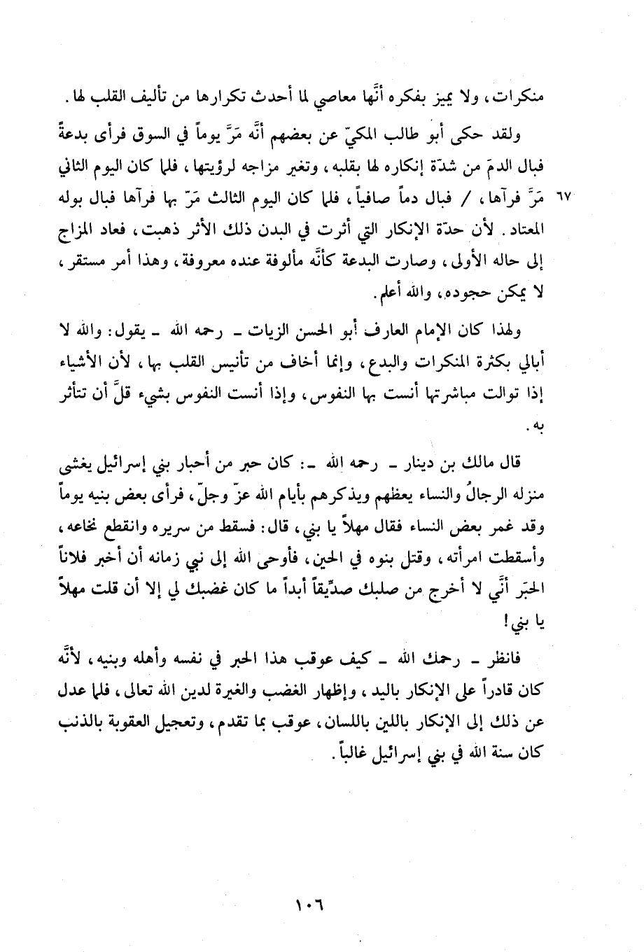 ولقد حكى أبو طالب المكيّ عن بعضهم أنَّه مرَّ يومًا في السوق فرأى بدعة فبال الدم من شدة إنكاره لها بقلبه، وتغير مزاجه لرؤيتها، فلما كان اليوم الثاني مر فرآها، / فبال دمًا صافيًا، فلما كان اليوم الثالث مرَّ بها فرآها فبال بوله المعتاد. لأن حدة الإنكار التي أثرت في البدن ذلك الأثر ذهبت، فعاد المزاج إلى حالة الأولى، وصارت البدعة كأنه مألوفة عنده معروفة، وهذا أمر مستقر، لا يمكن جحوده، والله أعلم.