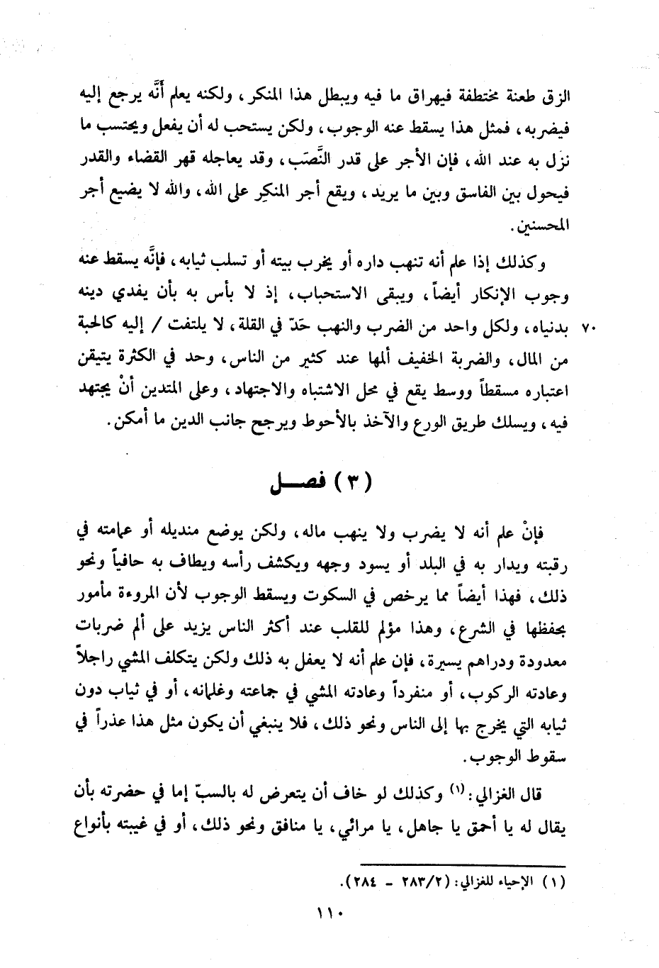 وكذلك إذا علم أنه تنهب داره أو يخرب بيته أو تسلب ثيابه، فإنه يسقط عنه وجوب الإنكار أيضًا، ويبقي الاستحباب، إذ لا بأس به بأن يفدي دينه بدنياه، ولكل واحد من الضرب والنهب حد في القلة، لا يلتفت/ إليه كالحبة من المال، والضربة الخفيف ألمها عند كثير من الناس، وحد في الكثرة يتيقن اعتباره مسقطاً ووسط يقع في محل الاشتباه والاجتهاد، وعلى المتدين أن يجتهد فيه، ويسلك طريق الورع والآخذ بالأحوط ويرجع جانب الدين ما أمكن.
