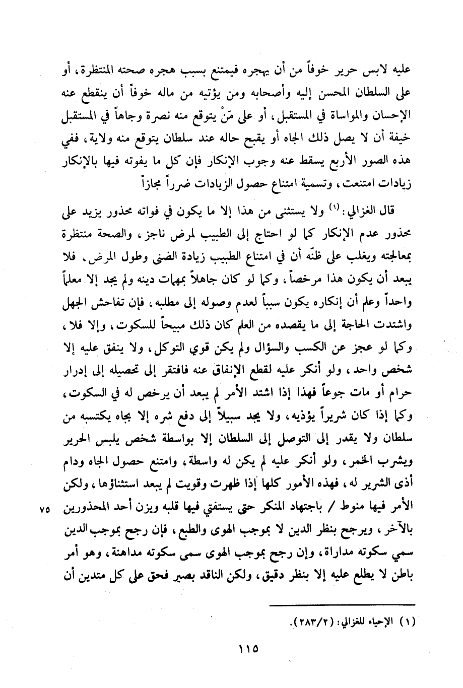 عليه لابس حرير خوفًا من أن يهجره فيمتنع بسبب هجره صحته المنتظرة، أو على السلطان المحسن إليه وأصحابه ومن يؤتيه من ماله خوفًا أن ينقطع عنه الإحسان والمواساة في المستقبل، أو على من يتوقع من نصرة وجاهًا في المستقبل خيفة أن لا يصل ذلك الجاه أو يقبح حاله عند سلطان يتوقع منه ولاية، ففي هذه الصورة الأربع يسقط عنه وجوب الإنكار فإن كل ما يفوته فيها بالإنكار زيادات امتنعت، وتسمية امتناع حصول الزيادات ضررًا مجازًا.