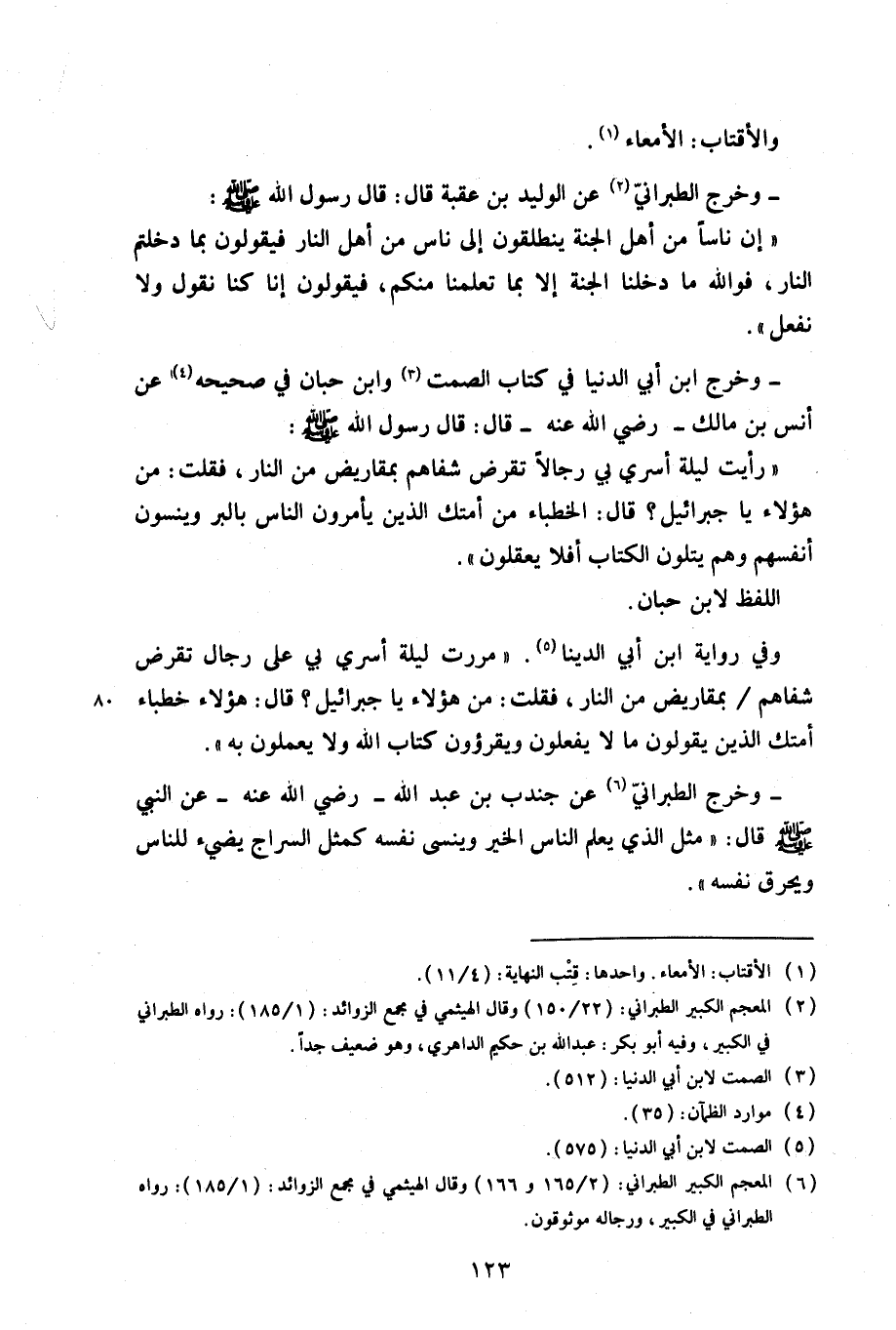 وفي رواية ابن أبي الدنيا. «مررت ليلة أسري بي على رجال تقرض شفاهم/ بمقاريض من نار، فقلت: من هؤلاء يا جبرائيل؟ قال: هؤلاء خطباء أمتك الذين يقولون ما لا يفعلون ويقرؤون كتاب الله ولا يعملون به».