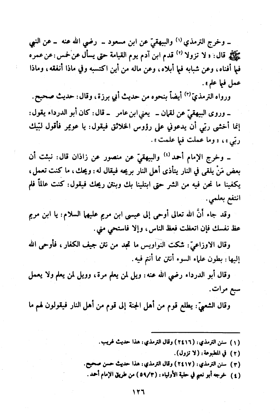 - وخرج الترمذي والبيهقي عن ابن مسعود رضي الله عنه- عن النبي صلى الله عليه وسلم قال: «لا تزولا قدم ابن آدم يوم القيامة حتى يسأل عن خمس: عن عمره فيما أفناه، وعن شبابه فيما أبلاه، وعن ماله من أين اكتسبه وفي ماذا أنفقه، وماذا عمل فيما علم».