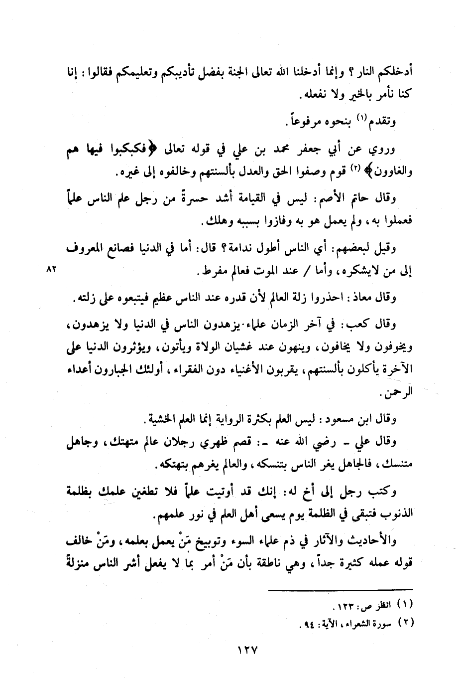 وقال حاتم الأصم: ليس في القيامة أشدة حسرة من رجل علم الناس علمًا، فعملوا به، ولم يعمل هو به وفازوا بسببه وهلك.