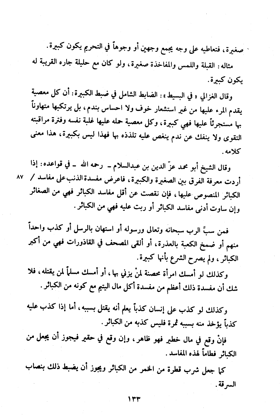 وقال الشيخ أبو محمد عز الدين بن عبد السلام -رحمه الله- في قواعده: إذا أردت معرفة الفرق بين الصغيرة والكبيرة، فاعرض مفسدة الذنب على مفاسد/ الكبائر المنصوص عليها، فإن نقصت عن أقل مفاسد الكبائر فهي من الصغائر وإن ساوت أدنى مفاسد الكبائر أو ربت عليه فهي من الكبائر.