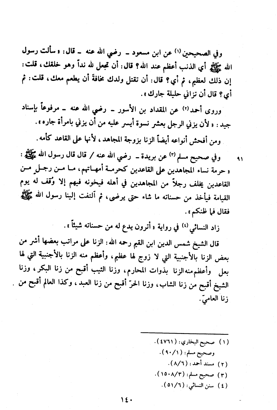 وفي الصحيحين عن ابن مسعود-رضي الله عنه- قال: «سألت رسول الله صلى الله عليه مسلم أي ذنب أعظم عند الله؟ قال: أن تجعل لله ندًا وهو خلقك، قلت: إن ذلك لعظيم، ثم أي؟ قال: أن تقتل ولدك مخافة أن يطعم معك، قلت: ثم أي؟ قال أن تزاني حليلة جارك».