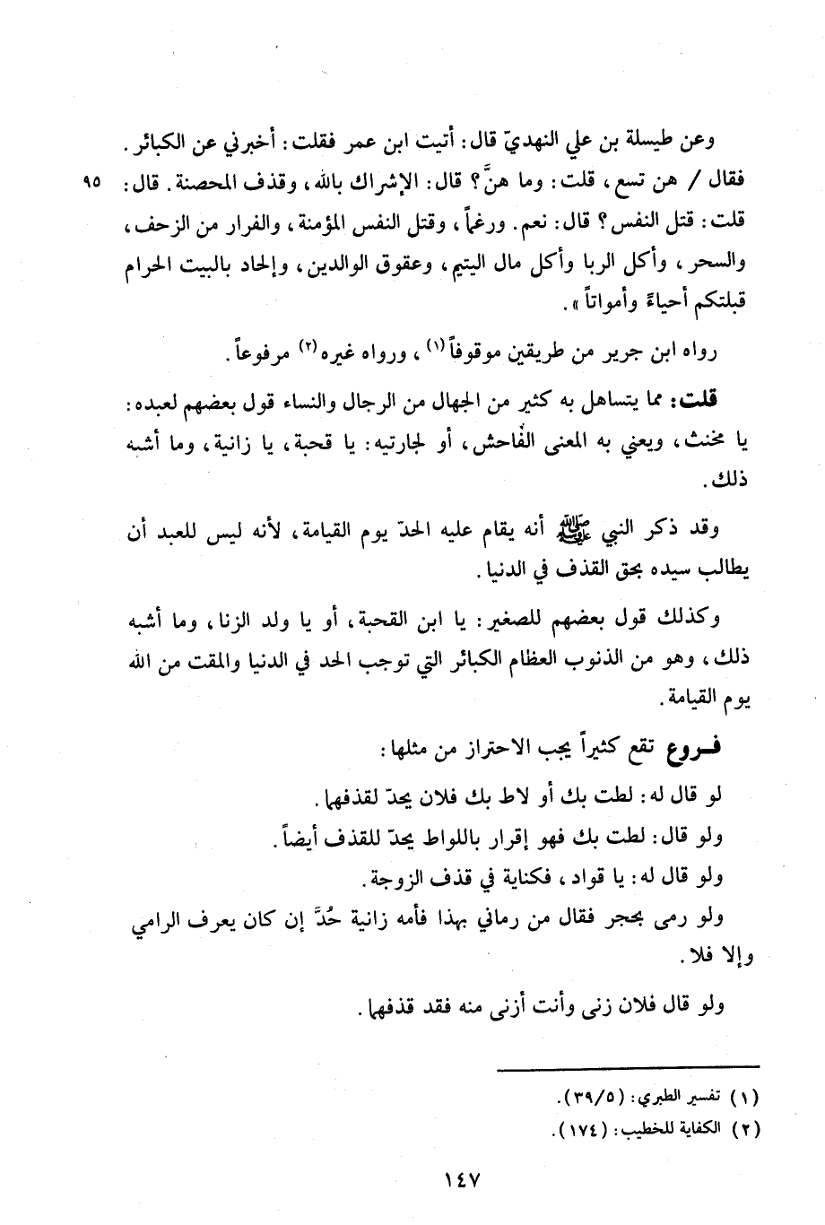 وعن طيسلة بن علي النهدي قال: «أتيت ابن عمر فقلت: أخبرني عن الكبائر. فقال/ هن تسع، قلت وما هن؟ قال: الإشراك بالله، وقذف المحصنة. قال: قلت: قتل النفس؟ قال: نعم. ورغمًا، وقتل النفس المؤمنة، والفرار من الزحف، والسحر، واكل الربا واكل مال اليتيم، وعقوق الوالدين، وإلحاد بالبيت الحرام قبلتكم أحياء وأمواتًا». رواه ابن جرير من طريقين موقوفًا، ورواه غيره مرفوعًا.