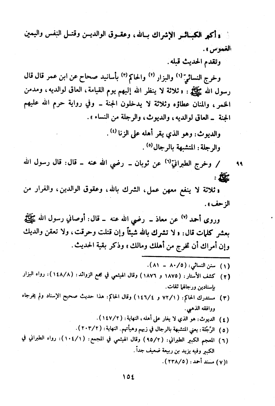 وخرج النسائي والبزار والحاكم بأسانيد صحاح عن ابن عمر قال قال رسول الله صلى الله عليه وسلم: «ثلاثة لا ينظر الله إليهم يوم القيامة، العاق لوالديه، ومدمن الخمر، والمنان عطاؤه وثلاثة لا يدخلون الجنة-وفي رواية حرم الله عليهم الجنة-العاق لوالديه، والديوث، والرجلة من النساء».
