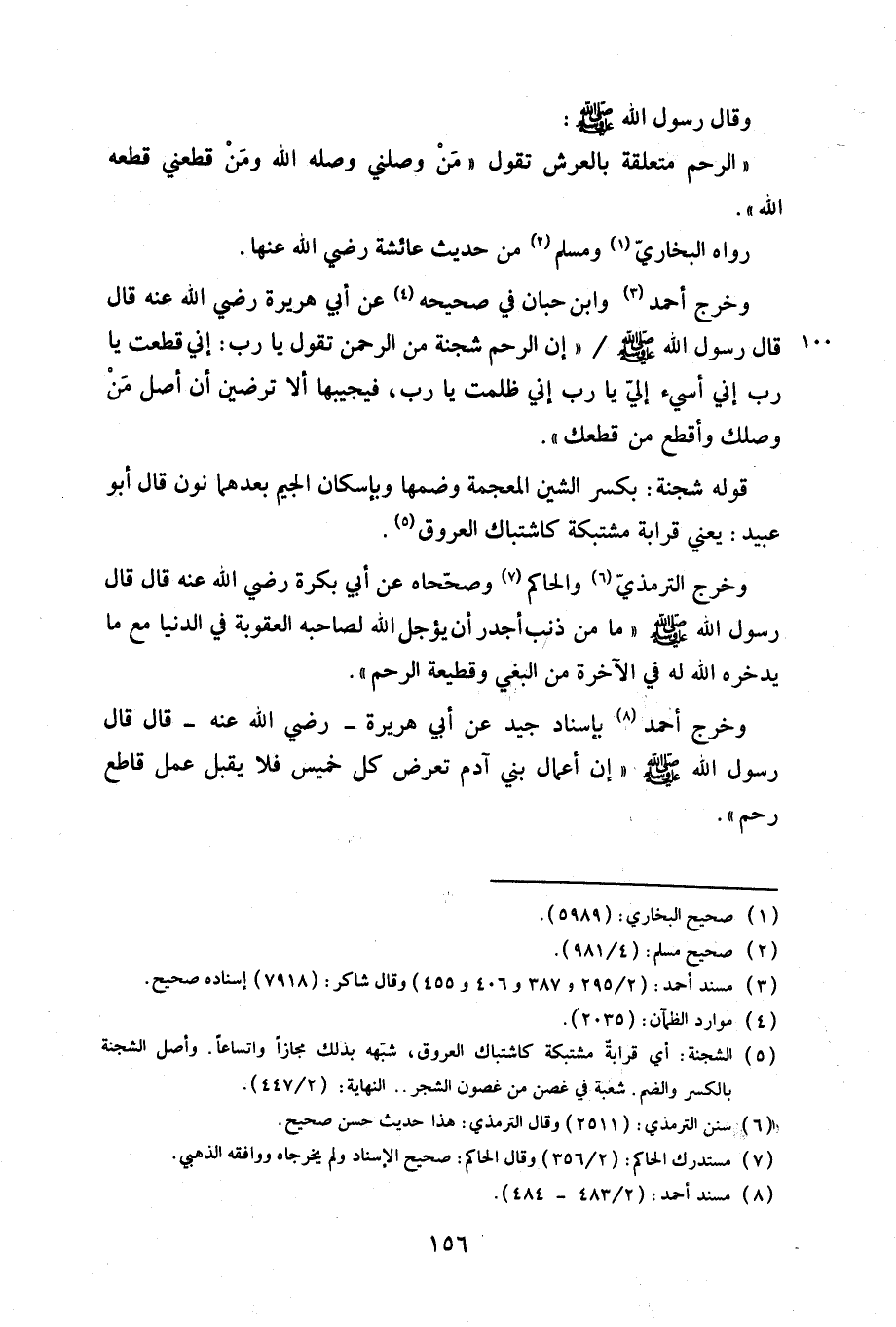 وخرج أحمد وابن حبان في صحيحه عن أبي هريرة رضي الله عنه قال قال رسول الله صلى الله عليه وسلم/ «إن الرحم شجنة من الرحمن تقول يا رب: إني قطعت يا رب إني أسئ إلي يا رب إني ظلمت يا رب، فيجيبها ألا ترضين أن أصل من وصلك وأقطع من قطعك».