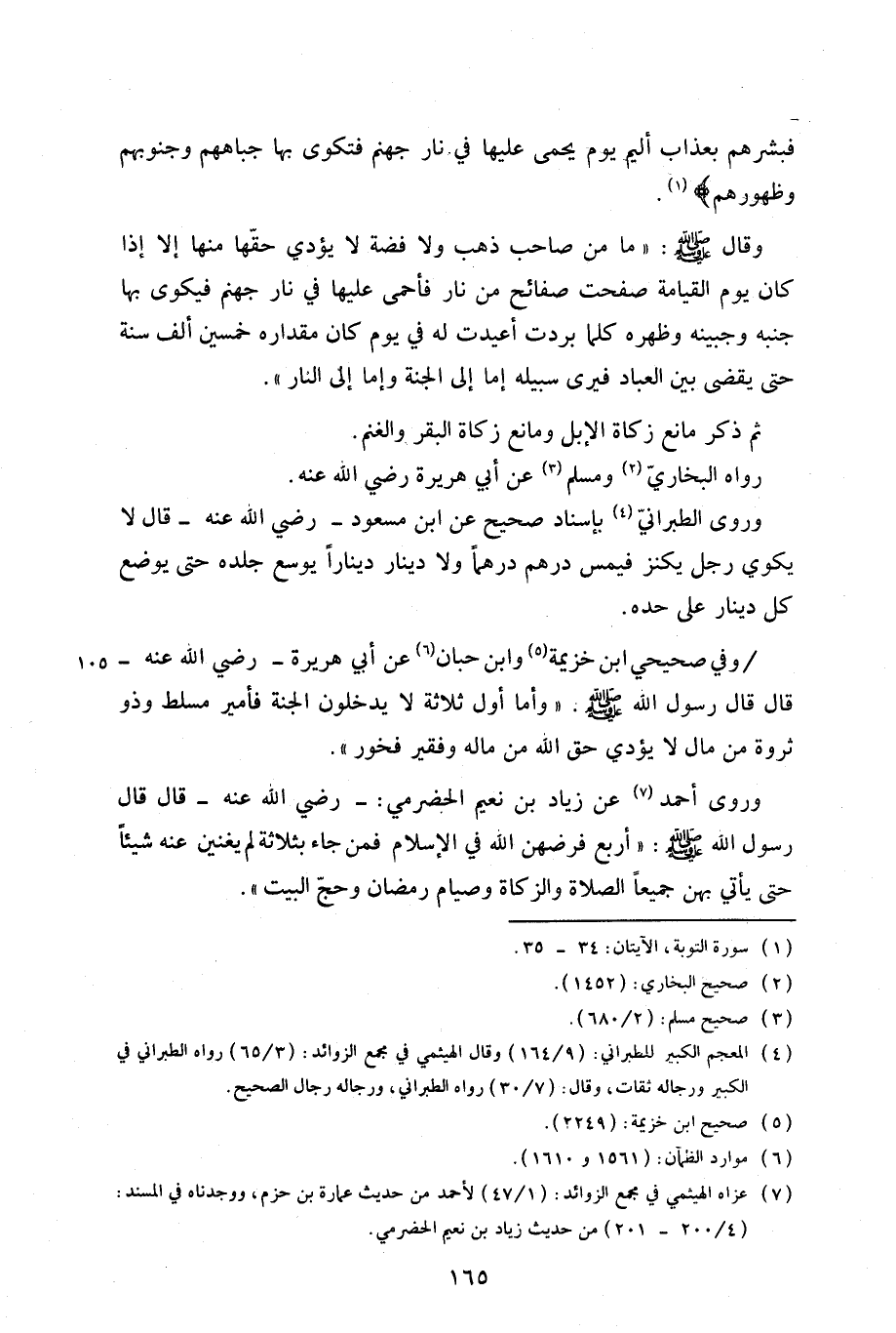 وقال صلى الله عليه وسلم: «ما من صاحب ذهب ولا فضة لا يؤدي حقها منها إلا إذا كان يوم القيامة صفحت صفائح من نار فأحمى عليها في نار جهنم فيكوى بها جنبه وجبينه وظهره كلما بردت أعيدت له يوم كان مقداره خمسين ألف سنة حتى يقضي بين العباد فيرى سبيله إما إلى الجنة وإما إلى النار».