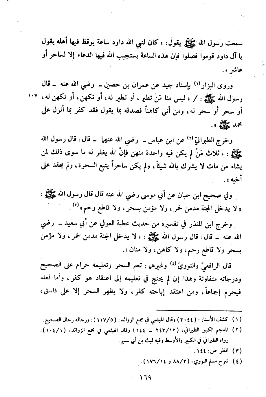 وخرج الطبراني عن ابن عباس-رضي الله عنهما-قال: قال رسول الله صلى الله عليه وسلم: «ثلاث من لم يكن فيه واحدة منهن فإن الله يغفر له ما سوى ذلك لمن يشاء من مات لا يشرك بالله شيئًا، ولم يكن ساحرًا يتبع السحرة، ولم يحقد على أخيه».
