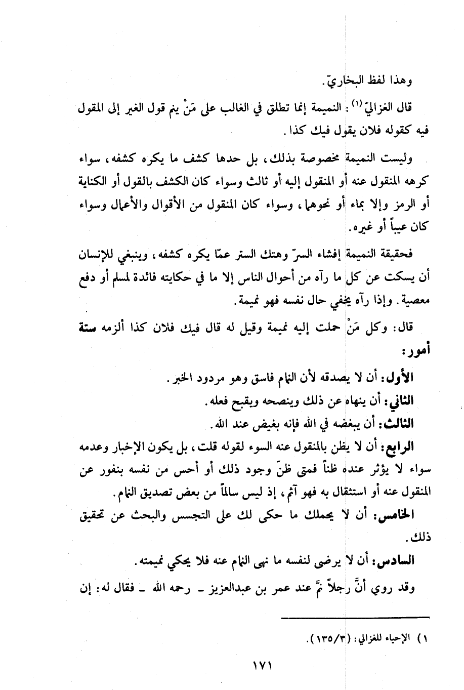 قال: وكل من حملت إليه نميمة وقيل له قال فيك فلان كذا ألزمه ستة أمور: