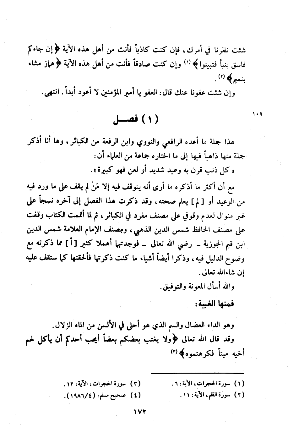 مع أن أكثر ما أذكره ما أرى أنه يتوقف فيه إلا من لم يقف على ما ورد فيه من الوعيد أو [لم] يعلم صحته، وقد ذكرت هذا الفصل إلى آخرة نسجًا على غير منوال لعدم وقوفي على مصنف مفرد في الكبائر، ثم لما أتممت الكتاب وقفت على مصنف الحافظ شمس الدين الذهبي، ومصنف الإمام العلامة شمس الدين ابن قيم الجوزية-رضي الله تعالى-فوجدتهما أهملا كتير [اّ] مما ذكرته مع وضوح الدليل فيه، وذكرا أيضًا أشياء ما كنت ذكرتها فألحقها كما ستقف عليه إن شاء الله تعالى.
