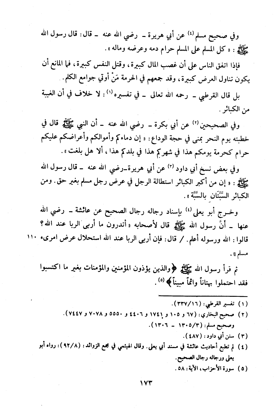 وخرج أبو يعلى بإسناد رجاله رجال الصحيح عن عائشة-رضي الله عنها-أن رسول الله صلى الله عليه وسلم قال لأصحابه «أتدرون ما أربى الربا عند الله؟ قالوا: الله ورسوله أعلم./ قال: فإن أربى الربا عند الله استحلال عرض امرئ مسلم».