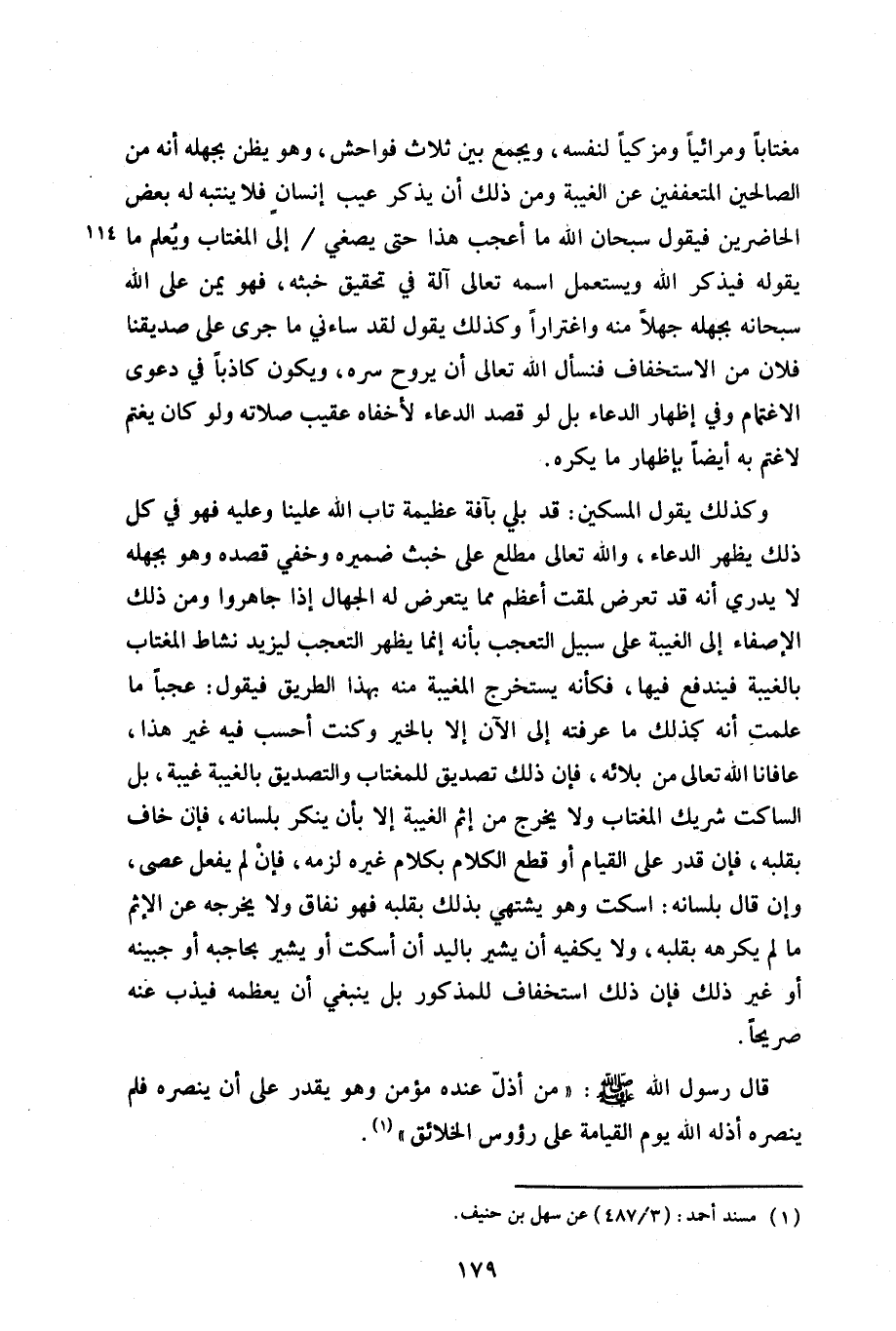 مغتابًا ومرائيًا ومزكيًا لنفسه، ويجمع بين ثلاث فواحش، وهو يظن بجهله أنه من الصالحين المتعففين عن الغيبة ومن ذلك أن يذكر عيب إنسان فلا ينتبه له بعض الحاضرين فيقول سبحان الله ما أعجب هذا حتى يصغي/ إلى المغتاب ويُعلم ما يقوله فيذكر الله ويستعمل اسمه تعالى آلة في تحقيق خبثه، فهو يمن على الله سبحانه بجهله جهلاً منه واغترارًا وكذلك يقول لقد ساءني ما جرى على صديقنا فلان من الاستخفاف فنسأل الله تعالى أن يروح سره، ويكون كاذبًا في دعوى الاغتمام وفي إظهار الدعاء بل لو قصد الدعاء لأخفاه عقيب صلاته ولو كان يغتنم لاغتنم أيضًا بإظهار ما يكره.