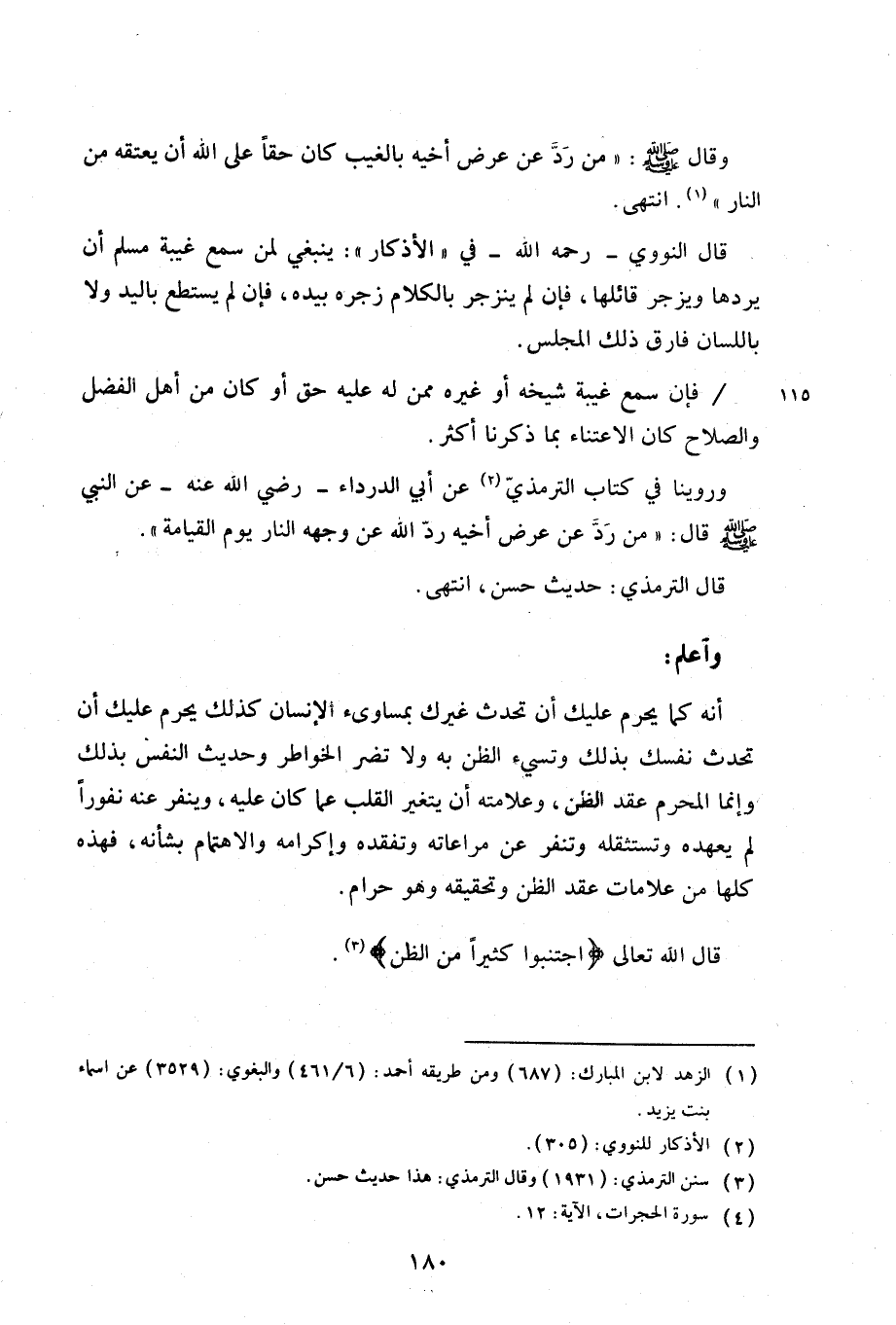 وقال صلى الله عليه وسلم: «من رد عن عرض أخيه بالغيب كان حقًا على الله أن يعتقه من النار». انتهى.
