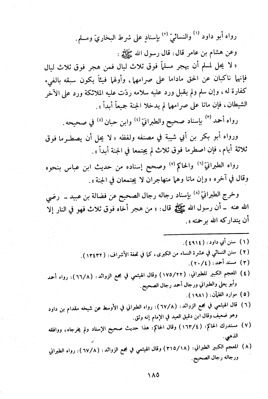 وعن هشام بن عامر قال: قال رسول الله صلى الله عليه وسلم: «لا يحل لمسلم أن يهجر مسلمًا فوق ثلاث ليال فمن هجر فوق ثلاث ليال فإنهما ناكبان عن الحق ما داما على صرامهما، وأولهما فيئًا يكون سبقه بالفيء كفارة له، وإن سلم ولم يقبل ورد عليه سلامه ردت عليه الملائكة ورد على الآخر الشيطان، فإن ماتا على صرامهما لم يدخلا الجنة جميعًا أبدًا».