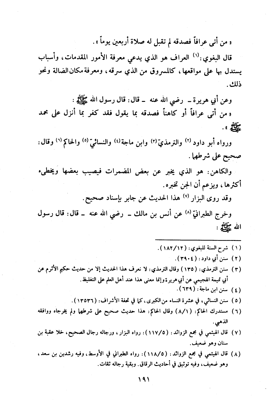 وعن أبي هريرة -رضي الله عنه- قال: قال رسول الله (صلى الله عليه وسلم): «من أتى عرافاً أو كاهناً فصدقه بما يقول فقد كفر بما أنزل على محمد (صلى الله عليه وسلم)».