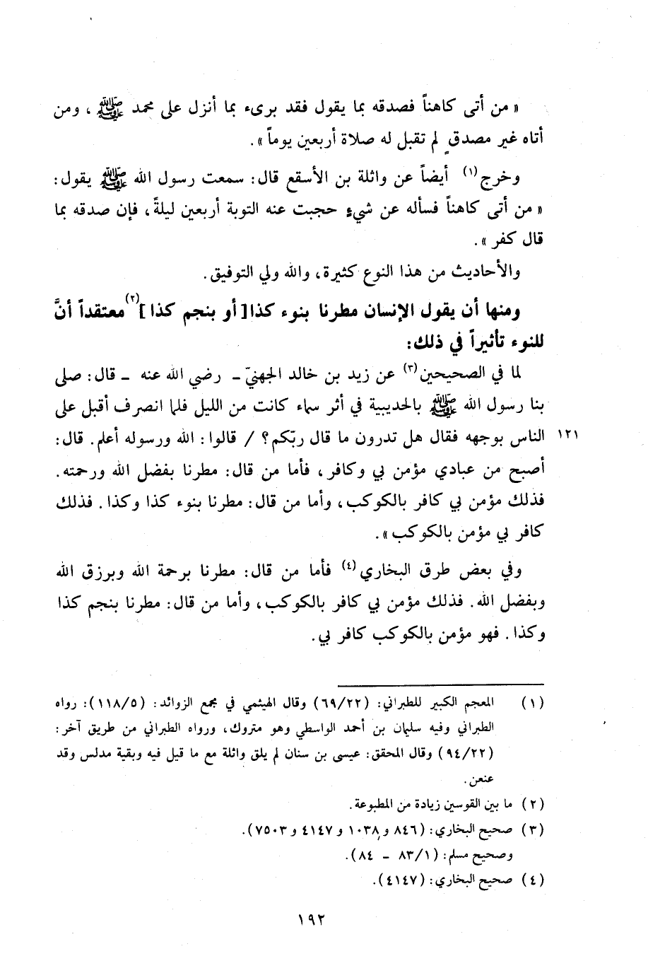 لما في الصحيحين عن زيد بن خالد الجهني -رضي الله عنه- قال: صلى بنا رسول الله (صلى الله عليه وسلم) بالحديبية في أثر سماء كانت من الليل فلما انصرف أقبل على الناس بوجهه فقال هل تدرون ما قال ربكم؟ / قالوا: الله ورسوله أعلم. قال: أصبح من عبادي مؤمن بي وكافر، فأما من قال: مطرنا بفضل الله ورحمته. فذلك مؤمن بي كافر بالكوكب، وأما من قال: مطرنا بنوء كذا وكذا. فذلك كافر بي مؤمن بالكوكب».