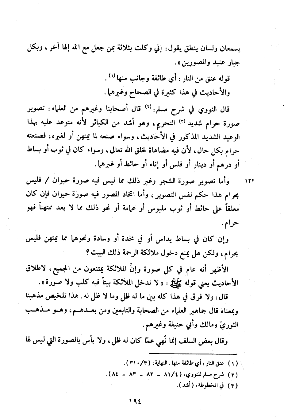 قال النووي في شرح مسلم: قال أصحابنا وغيرهم من العلماء: تصوير صورة حرام شديد التحريم، وهو أشد من الكبائر لأنه متوعد عليه بهذا الوعيد الشديد المذكور في الأحاديث، وسواء صنعه لما يمتهن أو لغيره، فصنعته حرام بكل حال، لأن فيه مضاهاة لخلق الله تعالى، وسواء كان في ثوب أو بساط أو درهم أو دينار أو فلس أو إناء أو حائط أو غيرهما.